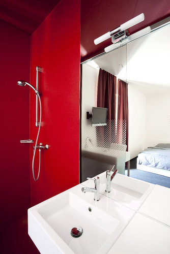 Niedrig gehaltene Baukosten waren die Voraussetzung für die moderaten Zimmerpreise des kleinen Hotels. Die Gästezimmer sind mit einer Größe von rund 14 m² – Doppelzimmer, 10 m² – Einzelzimmer auf ein Minimum reduziert, ohne jedoch klein zu wirken. Für Großzügigkeit sorgt die Kombination von Farbe und „offenen“ Sanitärräumlichkeiten, die nur durch Glaswände vom Zimmer getrennt sind. (Text: Architekten)