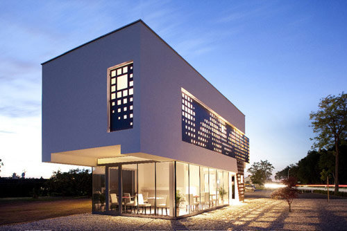Der Baukörper des Hotels entwickelt sich entlang der Straße und ist vom zentralen Kontenpunkt leicht von der Straßenflucht weggeknickt. Dieses Ausknicken aus der Straßenflucht gibt dem Baukörper eine stärkere Präsenz von der Bundesstrasse aus. Im Knick befindet sich der zentrale Knotenpunkt des Hotels, die Lobby, der Eincheckautomat, die außenliegende Erschließung.