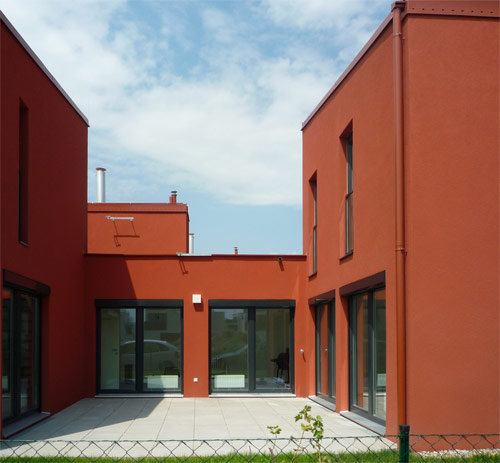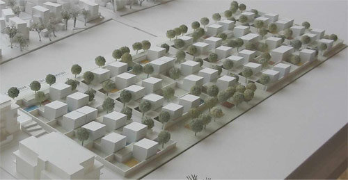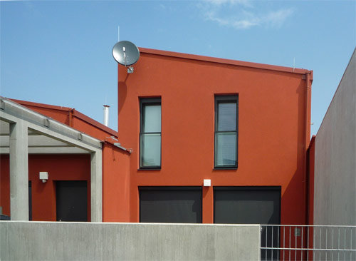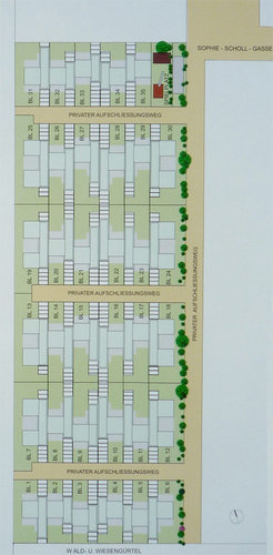 Seine konzeptuelle Stärke im Wohnungsbau hat Helmut Wimmer schon häufig unter Beweis gestellt, man denke etwa an das „Wohnregal“ in Wien-Ottakring oder an die gestapelte Kleingartensiedlung an der Breitenfurter Straße in Wien-Meidling. Derartigen Verdichtungskonzepten im Geschosswohnungsbau, die für die Bewohner stets eine gewisse Raumressource zur freien Entfaltung bereithielt, steht mit der Gartensiedlung Sophie-Scholl-Gasse eine Verdichtung in der Fläche gegenüber, wo die unterschiedlichen Schichten von Privatheit vor allem mit den Freiraumelementen Garten, Terrasse, Loggia und Carport moduliert werden. Das Grundstück ist in orthogonaler Strenge in 6 Reihenhauszeilen (insgesamt 35 Wohneinheiten, drei private Aufschließungswege) gegliedert, die aber keine stereotypen linearen Bänder bilden, sondern leicht versetzt in Größe und Struktur variieren. Die Häuser an den Rändern sind teilweise U-förmig um eine Terrasse angelegt, der Kerntypus eines Reihenhauses mit Pultdach und rund 80 m² Nutzfläche besteht aus einer langgestreckten Spange mit Carport (Betonbügel), Eingang, Vorraum, offener Küche mit WC und Abstellraum sowie einem Bad mit Vorraum samt Austritt in die Loggia (Betonbügel). An dieses lineare Band grenzt – von der Wohnküche nur durch einen Unterzug getrennt – der „Zimmerkubus“ mit einer einläufigen Treppe ins Obergeschoss und beidseitigen Austritten zu den Terrassen. Eine der Vorzüge dieser phasenverschobenen Reihung von L- bzw. U-förmigen Häusern besteht in der Geschütztheit der Gärten und Terrassen sowie in ihrer Ausrichtung in mindestens zwei Himmelsrichtungen. In den Erschließungsgassen nehmen die Carports – entsprechend der Bedeutung des Individualverkehrs in diesem teilweise immer noch gärtnerisch genutzten Gebiet – eine prominente Stellung ein. (Text: Gabriele Kaiser)