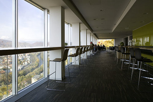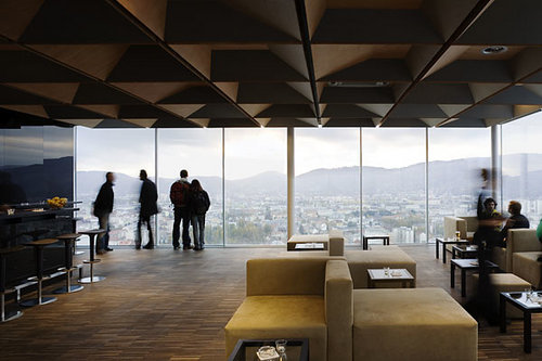 Eine weitere Zielvorstellung war, das Einzigartige des bestehenden Schlossbergrestaurants - seine Lage und Aussicht - stärker zu betonen. Dazu wurde die Fassade zur Stadt hin gänzlich geöffnet und über die Basteimauer hinausragend gebaut. Das neue Restaurant bietet einen sensationellen Blick über die Stadt, man schwebt förmlich über Graz.