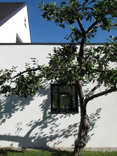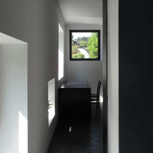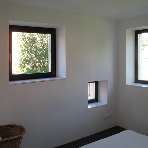 Offene Raumstrukturen prägen nun das einst in kleine Zimmer geteilte Erdgeschoß, Wände wurden an den Anschlussstellen zur Außenwand aufgebrochen, diese selbst als Hülle inszeniert, um das Haus innen größer wirken zu lassen. Der Effekt einer als Hülle oder Bekleidung wahrnehmbaren Außenwand wird mit der Umwandlung von geometrischen Fensterlöchern zu einer flächigen Struktur aus vielen unregelmäßig verteilten Fenstern erzielt. Die weiße Putzfarbe verleiht den Öffnungen mehr Tiefe und kontrastiert mit dem schwarzen Dach, das die Geometrie jenes Haustypus unterstreicht.