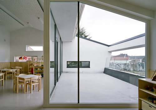 Aufgrund ökologischer Aspekte (Niedrigenergiehaus) und der Vorgabe einer kurzen Bauzeit wurde der Neubau in Holzriegelbauweise mit einem hohen Vorfertigungsgrad errichtet. Weiters erfüllen die errichtete Hackschnitzelheizung sowie eine Wohnraumlüftung die Ansprüche eines Niedrigenergiebaues. Großzügige Verglasungen Richtung Süden schaffen einen fließenden Übergang von Innen nach Außen. Die Wahl der Materialen folgt ökologischen, formalen und pädagogischen Kriterien. Großzügige, nach außen gekippte Terrassen im Obergeschoß stellen den Bezug zum Garten her. (Text: Architekt)