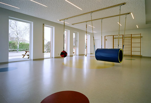 Im Erdgeschoß des Altbaus befinden sich der Haupteingang sowie die Krippe, das Obergeschoß beherbergt einen Bewegungsraum und Nebenräume. Über das großzügige Foyer im Erdgeschoß und dem anschließenden Verbindungsgang- einer „Brücke zwischen Alt und Neu“ – erreicht man den 4-gruppigen Kindergarten. Im Erdgeschoß befindet sich das LeiterInnenbüro mit zugeordnetem, barrierefrei erreichbarem Gruppenraum. Zentral angeordnet und für alle Gruppen gleichwertig erreichbar ist der Ess- und Küchenbereich. Der Bewegungsraum sowie ein Therapieraum sind ebenfalls barrierefrei erreichbar im Erdgeschoß situiert. Zwei Stiegenhäuser führen ins Obergeschoß, in welchem die restlichen 3 Gruppenräume angeordnet sind. Diesen sind großzügige beschattete Terrassen vorgelagert. Im Keller befinden sich Haustechnik, Hackgutlager und Archiv.