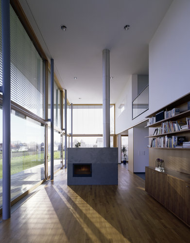 Große Schiebetüren ermöglichen einen niveaulosen Übergang zum Außenbereich. Im Erdgeschoß befinden sich Küche, Hauswirtschaftsraum, Garderobe, WC und ein Lagerraum sowie der Wohnraum mit einem breiten vorgelagerten Holzrost.