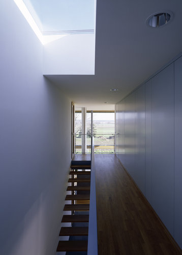 Die einläufige Treppe an der fensterlosen Mauer an der Grundstücksgrenze wird durch ein großzügiges Dachfenster belichtet.