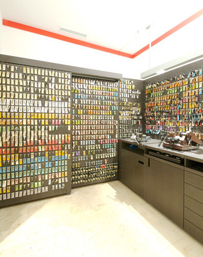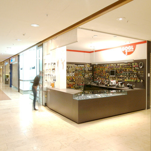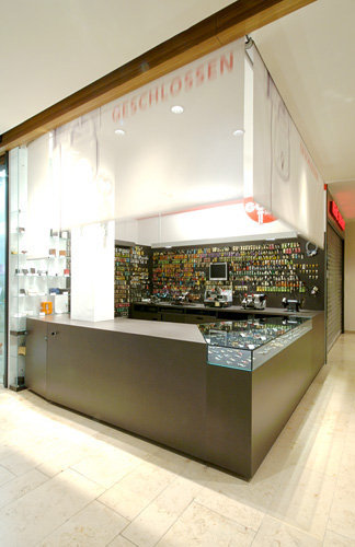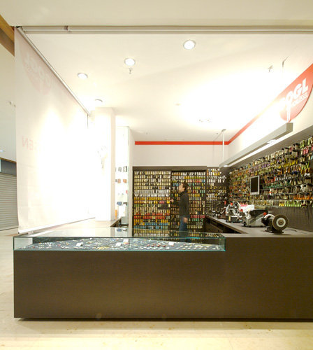 Das Möbel, das mittels Rollos geschlossen werden kann, ist zur Achse der Mall verdreht, die Auslage zum entspannten Kaufen von der frequentierten in die ruhigere Zone verschoben. Auch der bestehende Pfeiler, der sonst mitten in der Theke zu stehen gekommen wäre, stört so nicht, sondern wird zum Werbeträger. MDF pur oder gelocht und Glas – wo der kleine Abstand zum Nachbarn nicht sein durfte – sind die Materialien, auf und unter denen die unzähligen Kleinteile ihren Platz finden. Das dunkle Material ist Gegensatz zu und Rahmen für die sonst oft lieblos präsentierten Rohlinge, die zur schnellen Wiederfindung vor bunte Zettelchen gehängten Schlüssel und Metallspäne werden zum Schmuck. (Text: Claudia Wedekind nach einem Text der Architektin)
