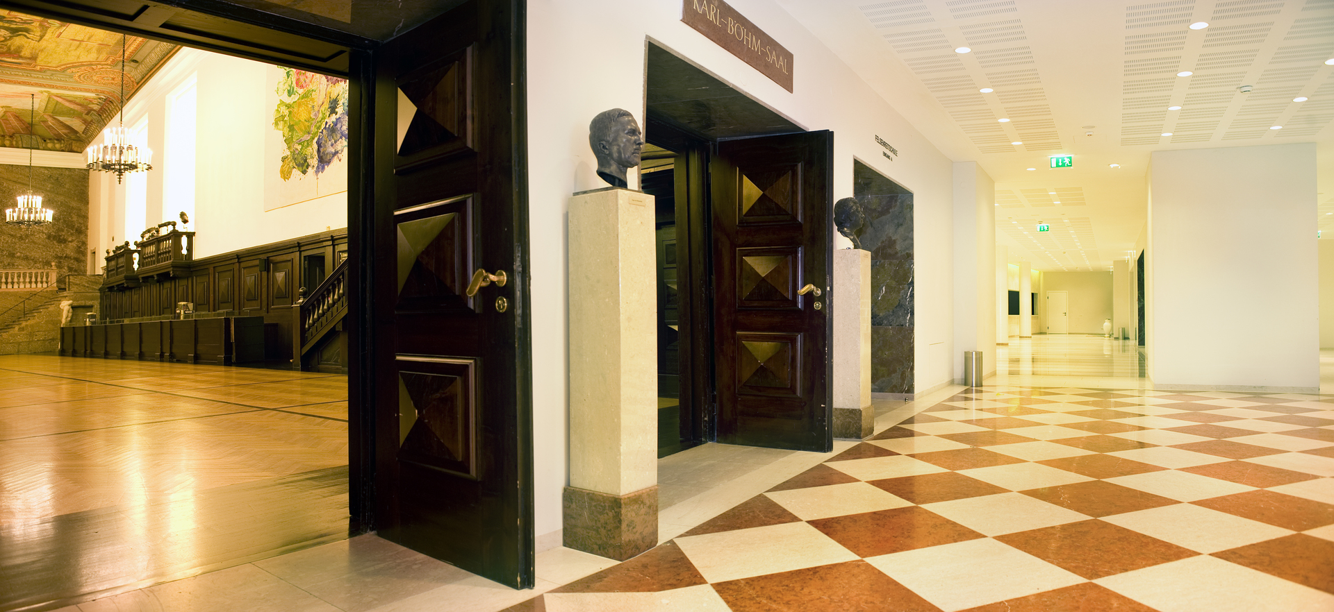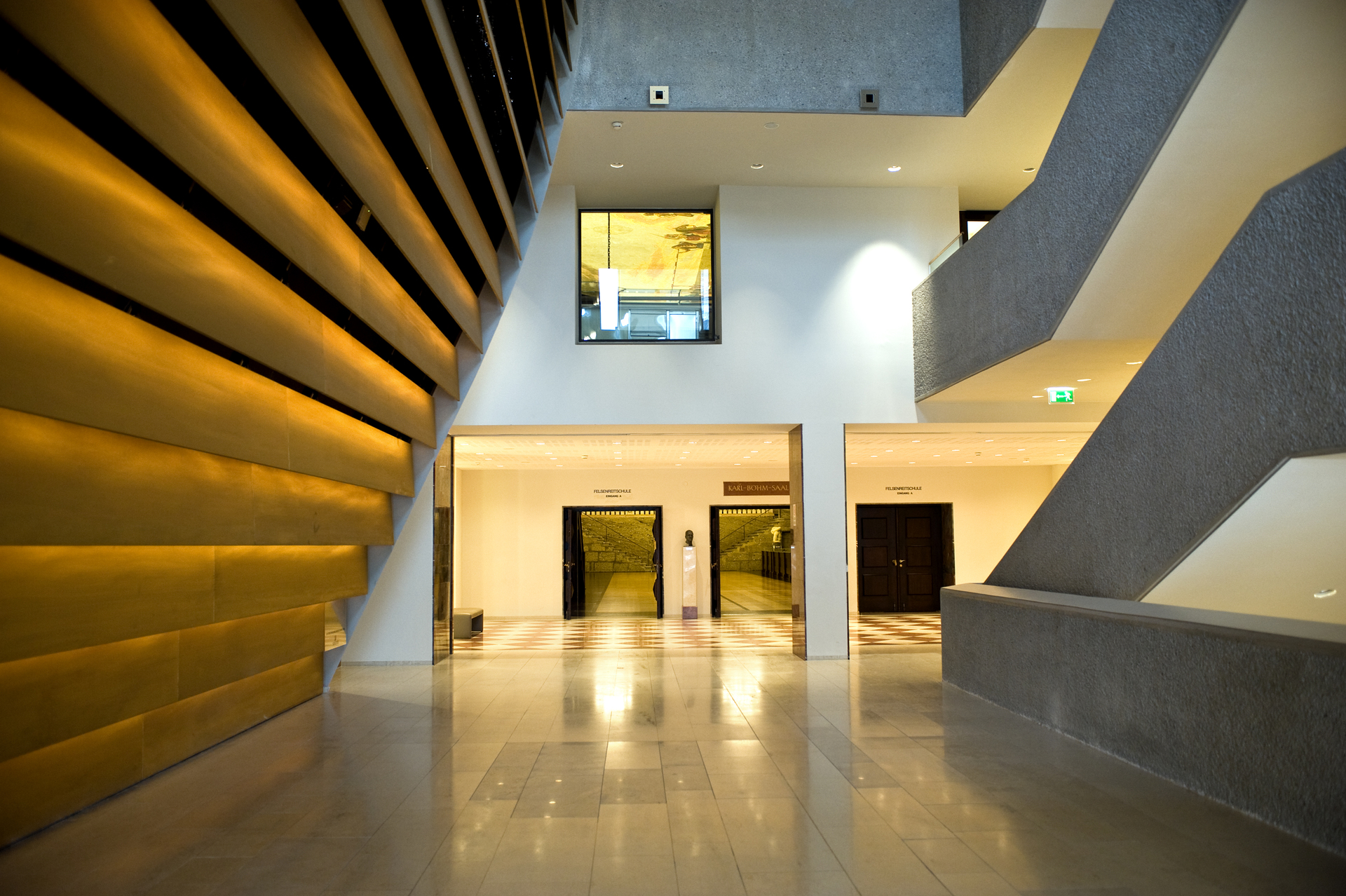 Holzmeisters von Kunstwerken begleitete Raumfolge vom Eingansportal zum Faistauer-Foyer beeindruckte in ihrer Kompakt- und Klarheit. Die von Jakob Adlhart 1926 geschaffene Mimenmaske in der Portal-Lünette vermittelte raffiniert zwischen Innen und Außen. 1937 ließ Holzmeister allerdings die Maske auf das neue Vordach setzen. Wilhelm Holzbauer ersetzte diesen Vorbau durch ein sehr massives, zu hoch situiertes Flugdach.
