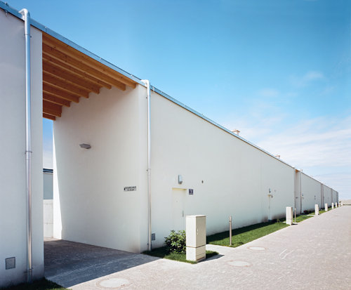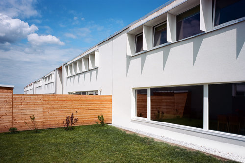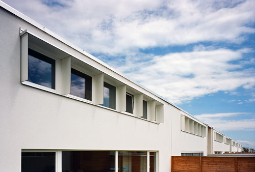 An der nördlichen und südlichen Grundgrenze wurden die zeilenförmigen Wohneinheiten zweigeschossig angelegt, wobei in den Obergeschoßen Sichtschutzblenden die Intimität der Gärten wahren. Im Binnenraum der beiden Zeilen sind ebenerdige Atriumhäuser mit begrünten Dächern, gemeinsamen Innenhöfen und Pergolen situiert.
