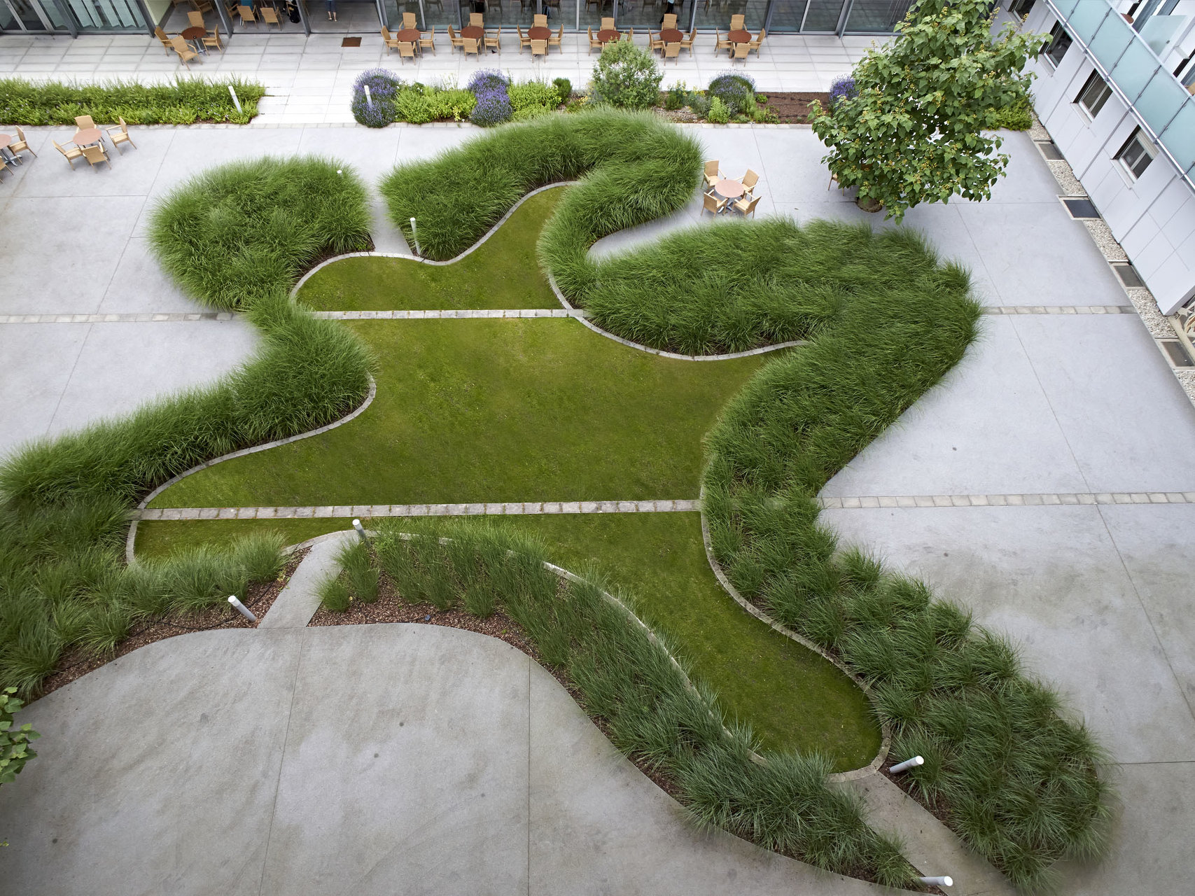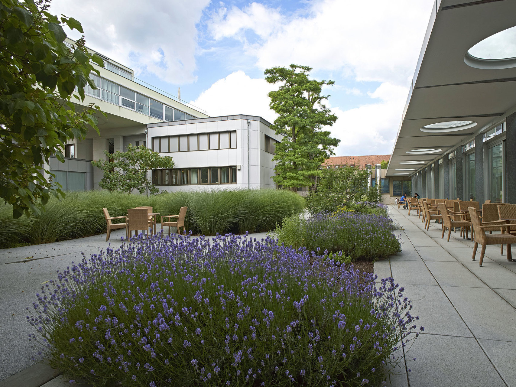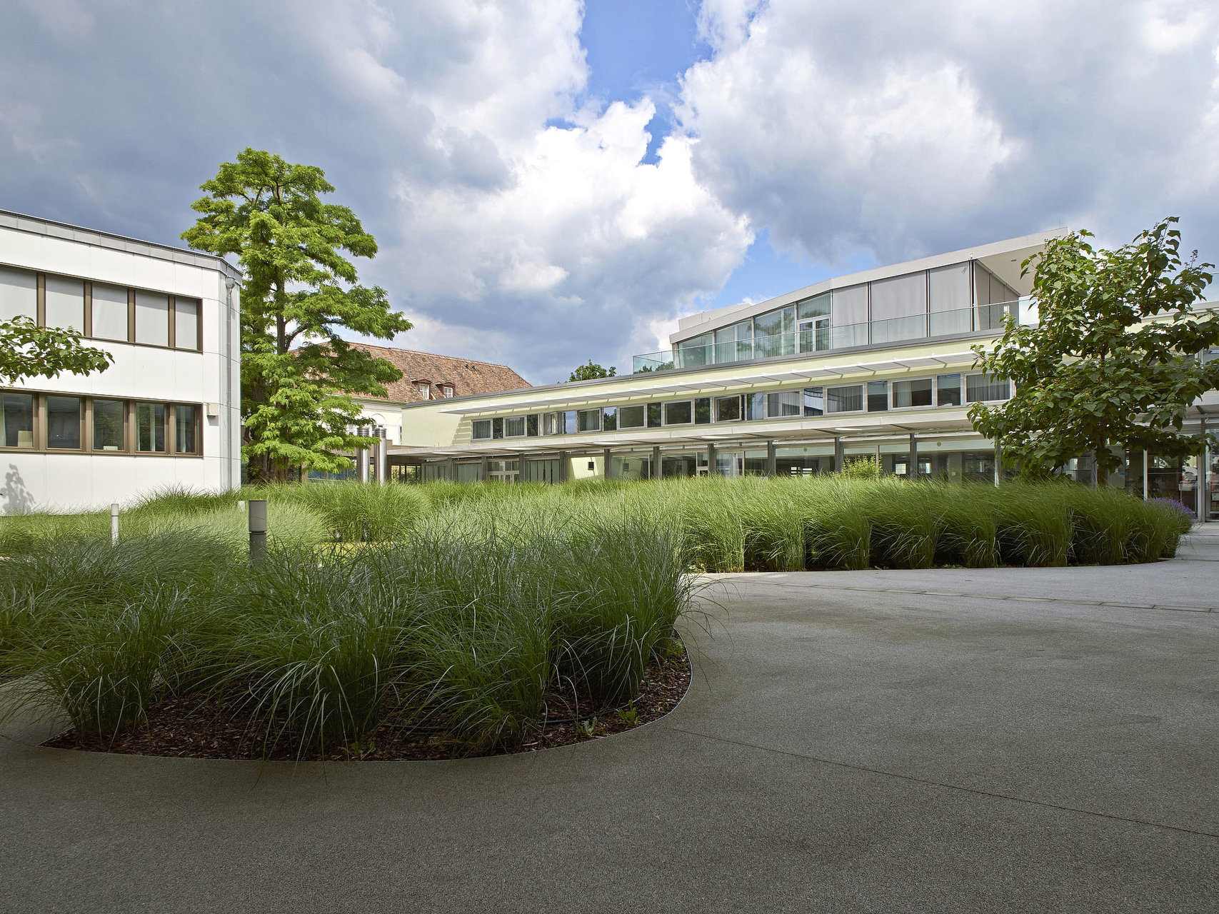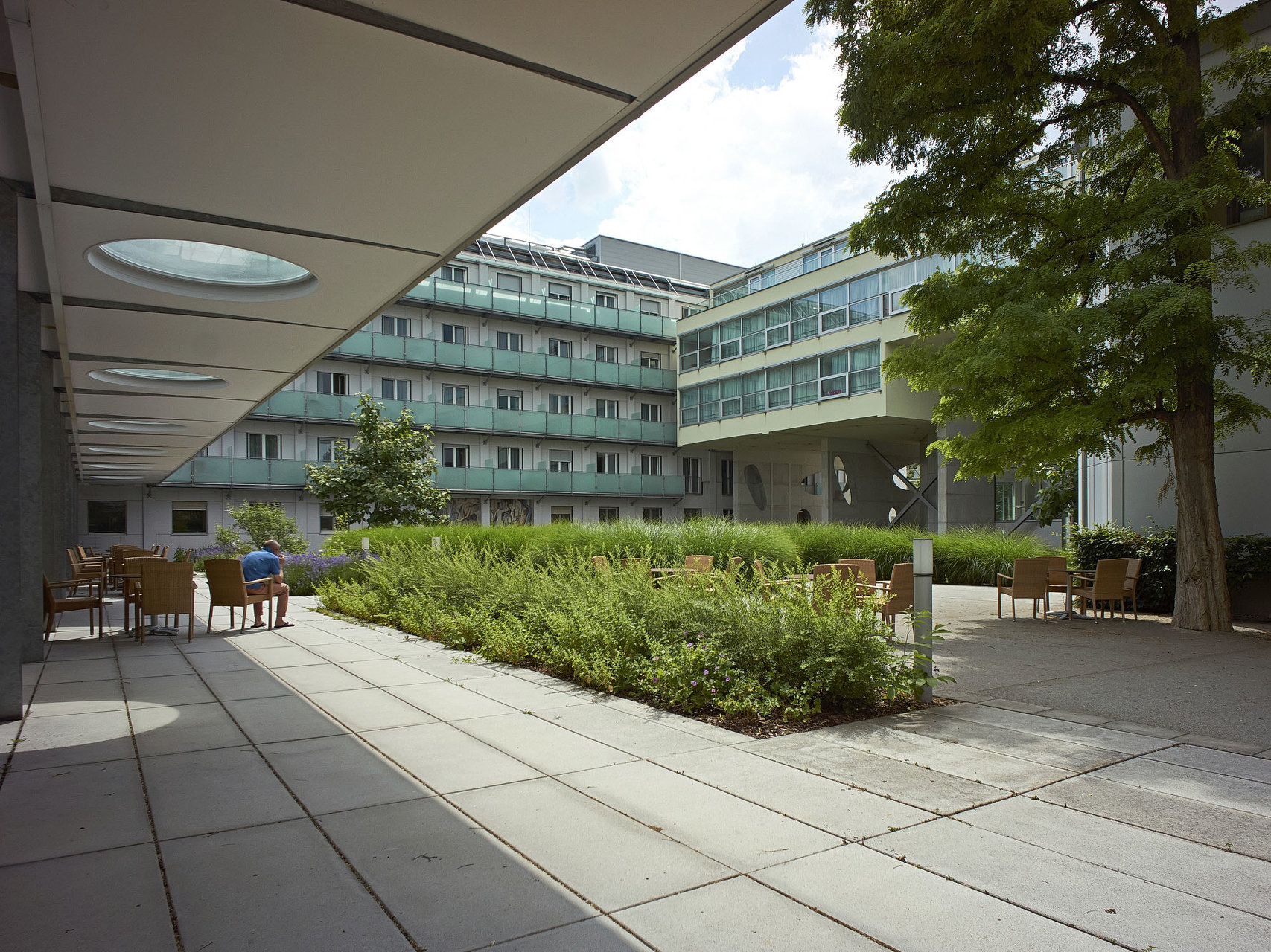 Damals, im Jahr 2001, fand ein geladener Wettbewerb mit drei Teilnehmern statt, den das Büro gewonnen hat. Mit gutem Grund, muss man nachträglich sagen, denn die ursprüngliche Substanz des Engelsbades umschloss einen großen Innenhof; und genau in den haben die beiden anderen Projektanten den geforderten neuen Bettentrakt hineingestellt. Veselinovic-Resetarits schlugen hingegen vor, diesen Bettentrakt als Brückenbauwerk über dem niedrigen Bestand – er enthält ein Therapiebad und ein großes Schwimmbad – zu errichten. So blieb der wunderbare Innenhof frei und erhalten, jetzt ist er von den Landschaftsplanern Cordula Loidl-Reisch und Anna Detzlhofer sogar besonders reizvoll bepflanzt.