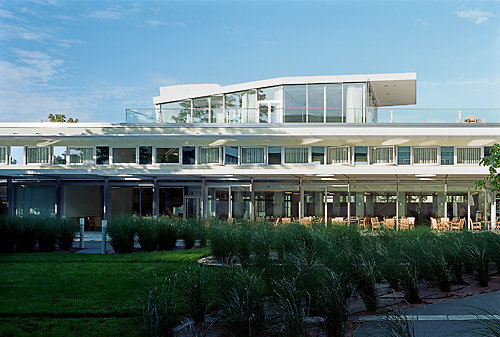 Die Architekten haben zunächst einmal das Notwendige gemacht. Und das betraf denBestand. Das Eingangsgebäude vorne zur Straße – mit einem von den Landschaftsplanern streifenförmig bepflanzten Vorplatz – ist jetzt ganz transparent. Glas hilft immer, da kann man sagen, was man will. Und drinnen ist die räumliche Lösung ein einziger Fluss. Sehr angenehme Aufenthaltsbereiche, mit Durchblick zum Restaurant. ZumInnenhof außerdem eine überdachte Terrassenlösung mit Rauchereck (sehr frequentiert), drinnen gibt es das nicht, in Zeiten der Raucherhatz möchte man natürlich konsequent sein. Auf diesem Eingangsgebäude, das zuvor nur einen Oberstock hatte, lastet jetzt der Aufbau eines Multifunktionssaals – der geteilt, aber auch zu einer großen Raumeinheit verbunden werden kann – mit angeschlossener Dachterrasse. Die gibt es übrigens auch beim neuen Bettentrakt über dem Schwimmbadkomplex des Bestands. Da haben die Architekten nicht nur eine Gemeinschaftsterrasse installiert, da sind im obersten Stock auch den Zimmern Freiräume zugeordnet.