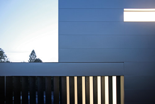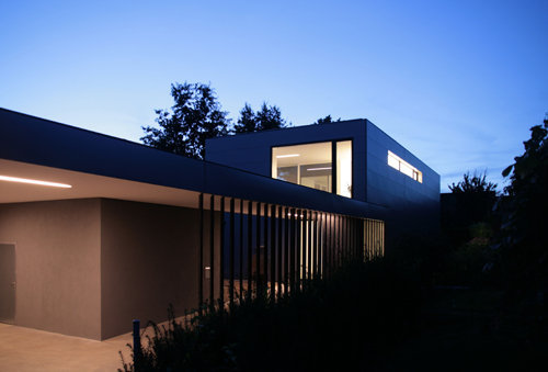 Wenige reduzierte Materialien, gezielt gesetzte Ausblicke und Raumsequenzen schaffen Atmosphäre für Raum und Licht. Die Metallfassade, ursprünglich ein Industrieprodukt, findet durch Perfektionierung im Detail die Anwendung als glatte Außenhülle. Die Einschnitte als Höfe im glatten Metallvolumen sind als Private Freiräume mit Reibputz lesbar.