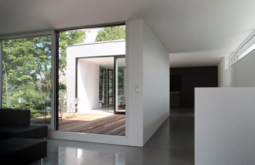 Weiterführend, den Blick nach Süden gewandt, erreicht man über den abfallenden Weg zwischen Hof und Luftraum die Wohnebene. Hier findet, leicht abgesenkt und geborgen, der Weg mit einem gerahmten Stadtblick seinen Abschluß. Der private Hof, als geschützter Freiraum zwischen Ess- und Wohnbereich gelegen, erfährt vielfältige Nutzungen im Tagesverlauf und ist das heimliche grüne Herz des Hauses. Bei Bedarf wird dieser Wohnhof verschattet bzw. vor Regen geschützt und erweitert so die Nutzungszeit.