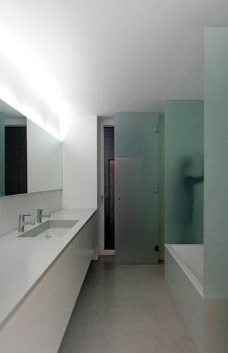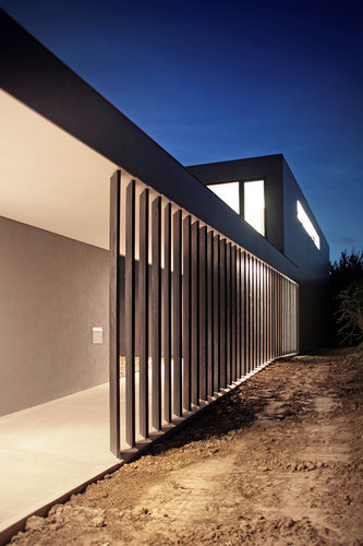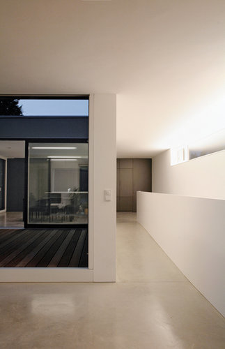 Eine leicht ansteigende Rohbetonrampe und der begleitende Lamellenvorhang fokussieren den Weg und leiten über einen intimen Vorhof in den Innenraum über. Linear über den Garderobenbereich führt der Weg weiter unterhalb eines Luftraumes zum Antritt der Betontreppe. Licht und Material leiten vom Privaten des Erdgeschoßes in das darüber liegende Wohngeschoß über. Eine ruhige dunkelgraue Küchenwand empfängt im Essbereich und verbirgt als rückseitiger Raumabschluss die Nebenräume. Lediglich ein schwarzer Einschnitt im Küchenverbau zeigt den Arbeitsbereich der Küche.
