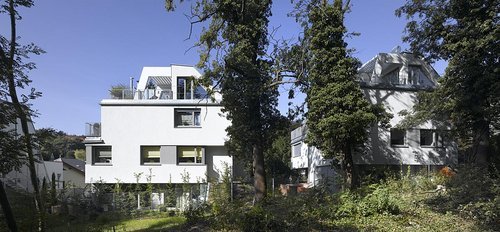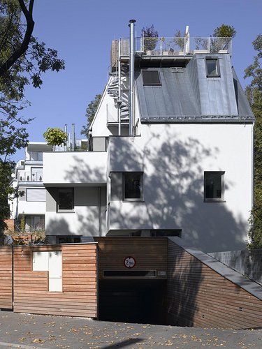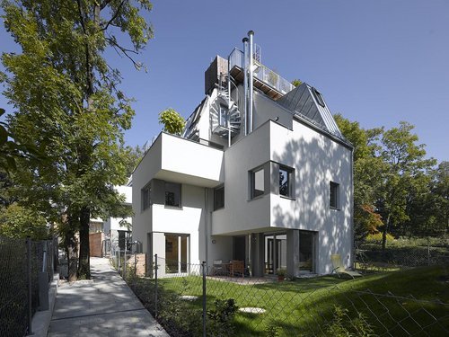 Jeweils zwei der vier Doppelhäuser mit Maisonette-Wohnungen sind baugleich, die beiden nördlichen Häuser sind vertikal geteilt, also zwei gespiegelte zueinander verschobene 4-geschoßige Wohnungen, die beiden südlichen horizontal geteilt. Somit bieten wir unterschiedliche Grundrisse in verschiedener Orientierung an, die sich wie ein Band das schmale Grundstück hinaufziehen. Alle Wohnungen haben direkten Zugang zu zugeordneten Freiflächen in mehreren Ebenen, bei den südlichen Häusern sind es je zwei, bei den nördlichen Häusern je drei Ebenen. Sechs Wohnungen haben zusätzlich über das Untergeschoß direkten Zugang zur Garage.