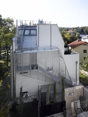 Vor- und Rücksprünge gliedern die Baukörper, dünklere Putzfelder fassen die Fensteröffnungen zu optisch wirksamen Flächen zusammen. Aufgrund der Hanglage notwendige Stützmauern wurden mit Lärchenschalung verkleidet – Garagenaufgang und Lüftung wurden in diese Wände integriert. (Text: Architekten)