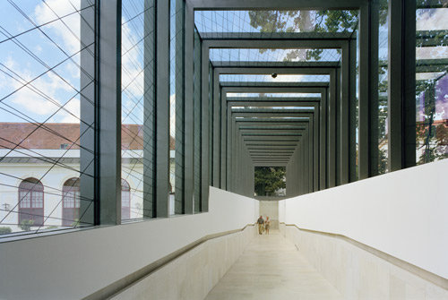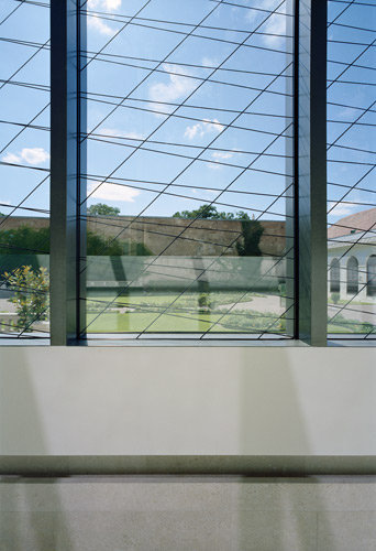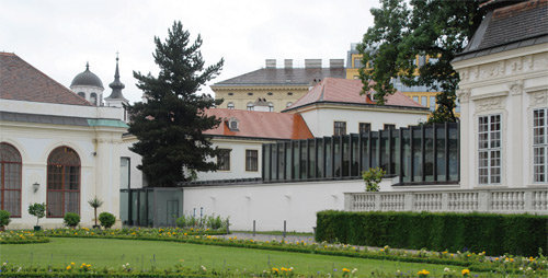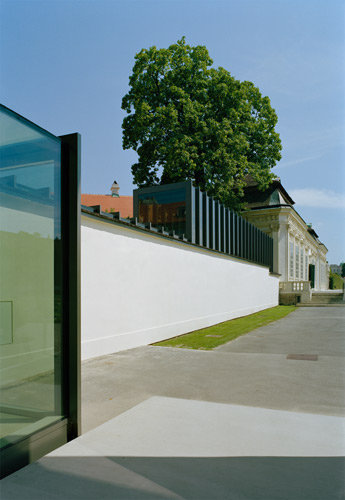 Der Entwurf macht sich die örtlichen Gegebenheiten zunutze, indem der Gang im Schatten der bestehenden denkmalgeschützten Mauer verläuft. Er liegt in einem Bereich, der bislang als Privatgarten weder zugänglich noch einsehbar war. Dadurch wird der historisch bedeutende und vor Kurzem wiederhergestellte Kammergarten physisch nicht berührt. Im direkten Umgang mit der barocken Architektur setzen wir im Verbindungsgang fort, was wir mit dem Umbau des Unteren Belvedere im Jahr 2007 begonnen haben: Durch das diskrete Einfügen zarter Stahltüren und -fenster haben wir historische Blickachsen wieder sichtbar gemacht und den Bezug zum Garten akzentuiert. In der gleichen Form bildet der Verbindungsgang als Stahlkonstruktion mit Glasfüllung eine diskrete Ergänzung ohne Anbiederung. Gleichzeitig verwenden wir mit dem Mannersdorfer Kalkstein für die Sockel- und Bodenbeläge der Rampen ein historisches Wiener Baumaterial, das bereits im Barock verarbeitet wurde und heute noch aktuell ist. Hier wie da geht es uns darum, das barocke Ensemble zur maximalen Wirkung zu bringen, ohne dabei unsere heutige Zeit zu verleugnen. (Text: Architekt)