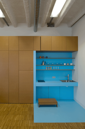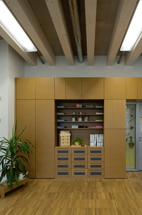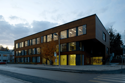 Modulbauweise mit Holzelementen und HolzBetonVerbund-Deckensystem; es wurden ausschließlich HFKW- und PVC-freie Baustoffe verwendet;
