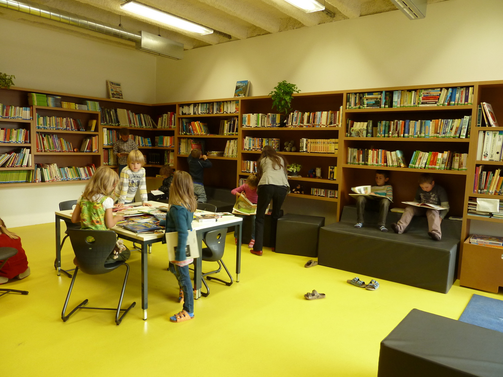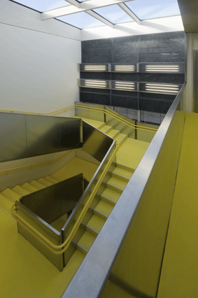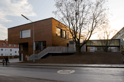 Das Gebäude ist komplett barrierefrei. Durch die Anhebung des Geländes wurde der direkte Ausgang der Nachmittagsbetreuungseinheiten bzw. des Erdgeschosses an den Grünraum möglich – barrierefreie Zugänge zur Terrasse entstehen.