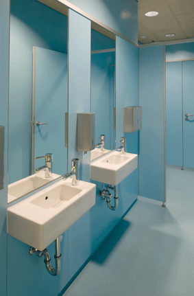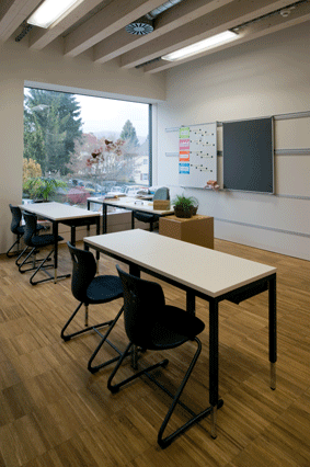 Die Klassenräume sind mit einer Komfort-Lüftung mit variablen Volumenstromreglern ausgestattet. Die Luftmenge kann von jedem Hauptraum über die zentrale Leittechnik einfach an den Bedarf angepasst werden. Die Temperaturregelung der einzelnen mit Fußbodenheizung beheizten Räume erfolgt über ein Gebäudeleittechniksystem.