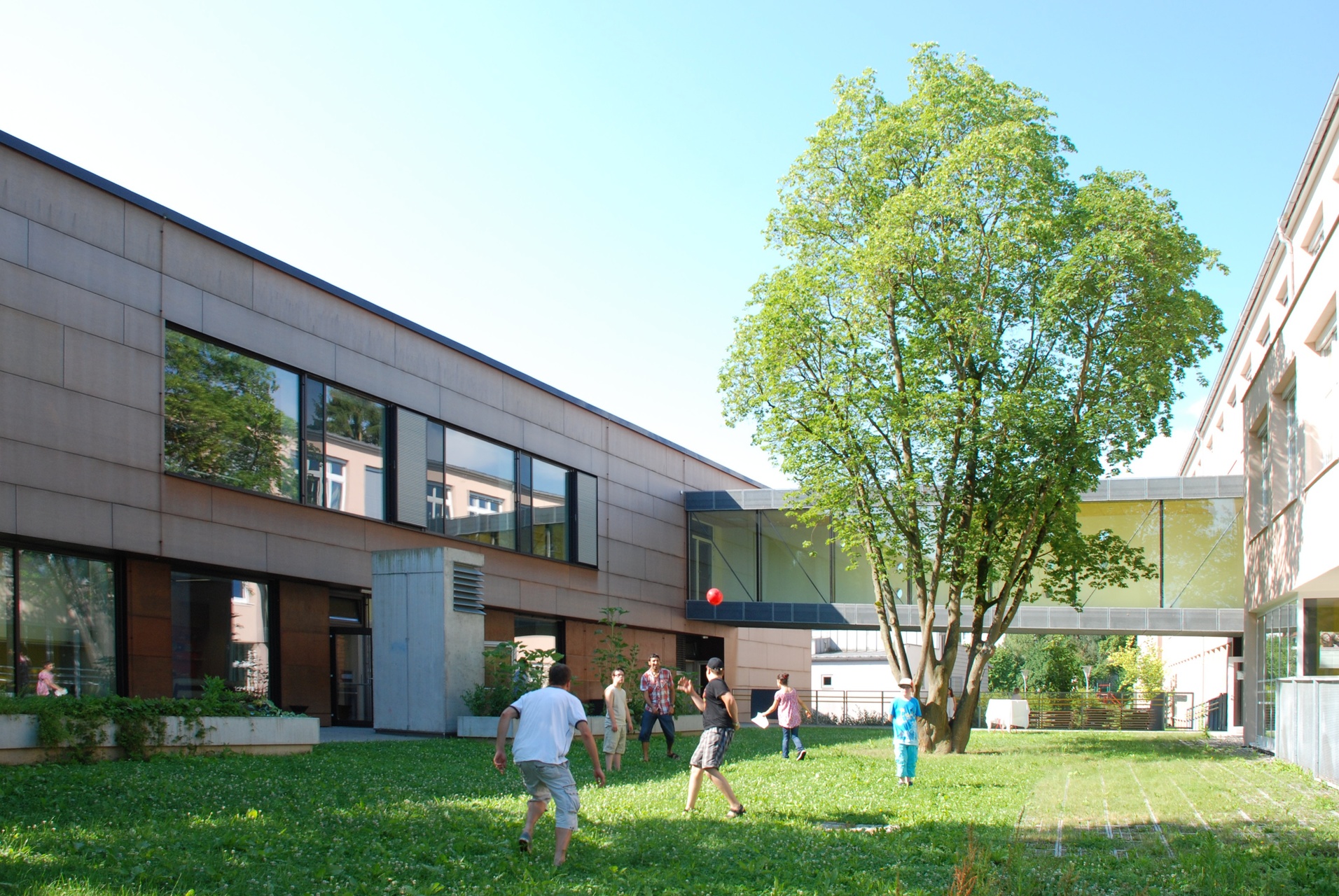 Durch den Abbruch des Verbindungsganges im EG und dessen Neuerrichtung im OG als Brückenkonstruktion wurde der Schulgarten mit dem Spielplatz verbunden.