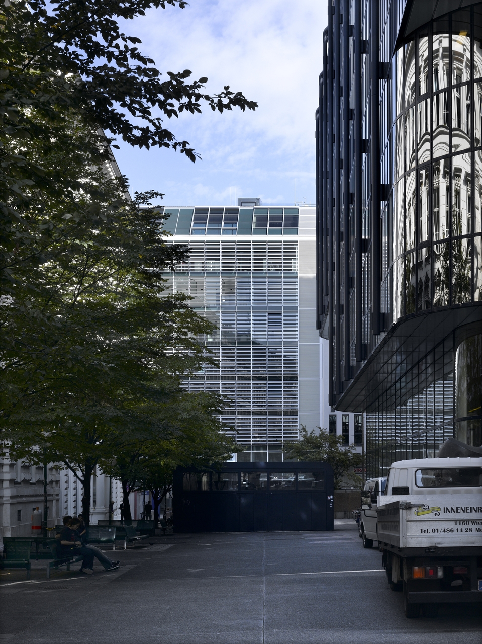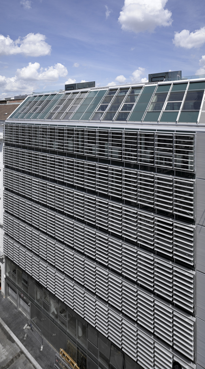 Die Fassaden wurden als Pfosten-Riegel Konstruktion mit raumhoher Verglasung ausgebildet und fügen sich gestalterisch in die Straßenfronten ein. Der Sonnenschutz bestimmt das unterschiedliche äußere Erscheinungsbild. An der Wipplinger Straße wird er durch eine zwischen den Scheiben liegende, zarte Lamellenkonstruktion, an der Hohenstaufengasse durch außen liegende bewegliche Alulamellen gewährleistet. Die Gesimse der Nachbargebäude werden als gestalterisches Element in Form einer Lichtleiste aufgenommen. Die Innenhoffassaden weiten durch die Schrägstellung von 6,5 Grad den Hof optisch auf. Sie sind raumhoch verglast und verfügen im Bereich der Büroräume über ein außen liegendes textiles Beschattungssystem. (Text: Architekten)