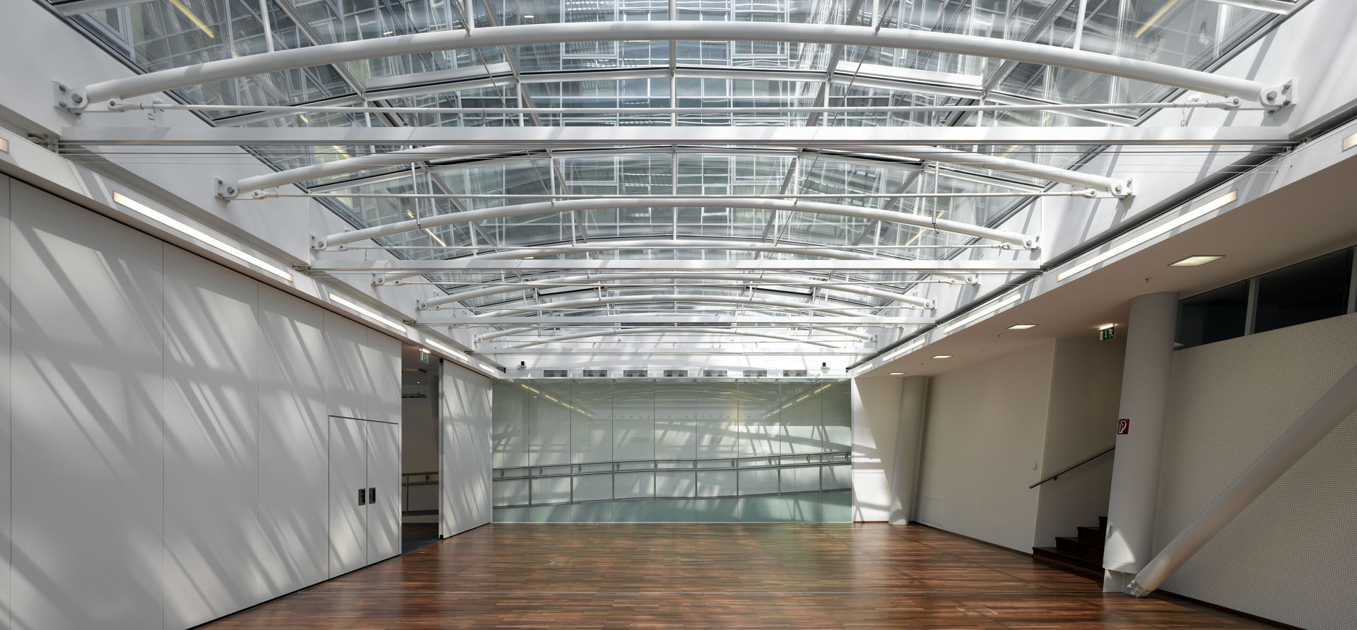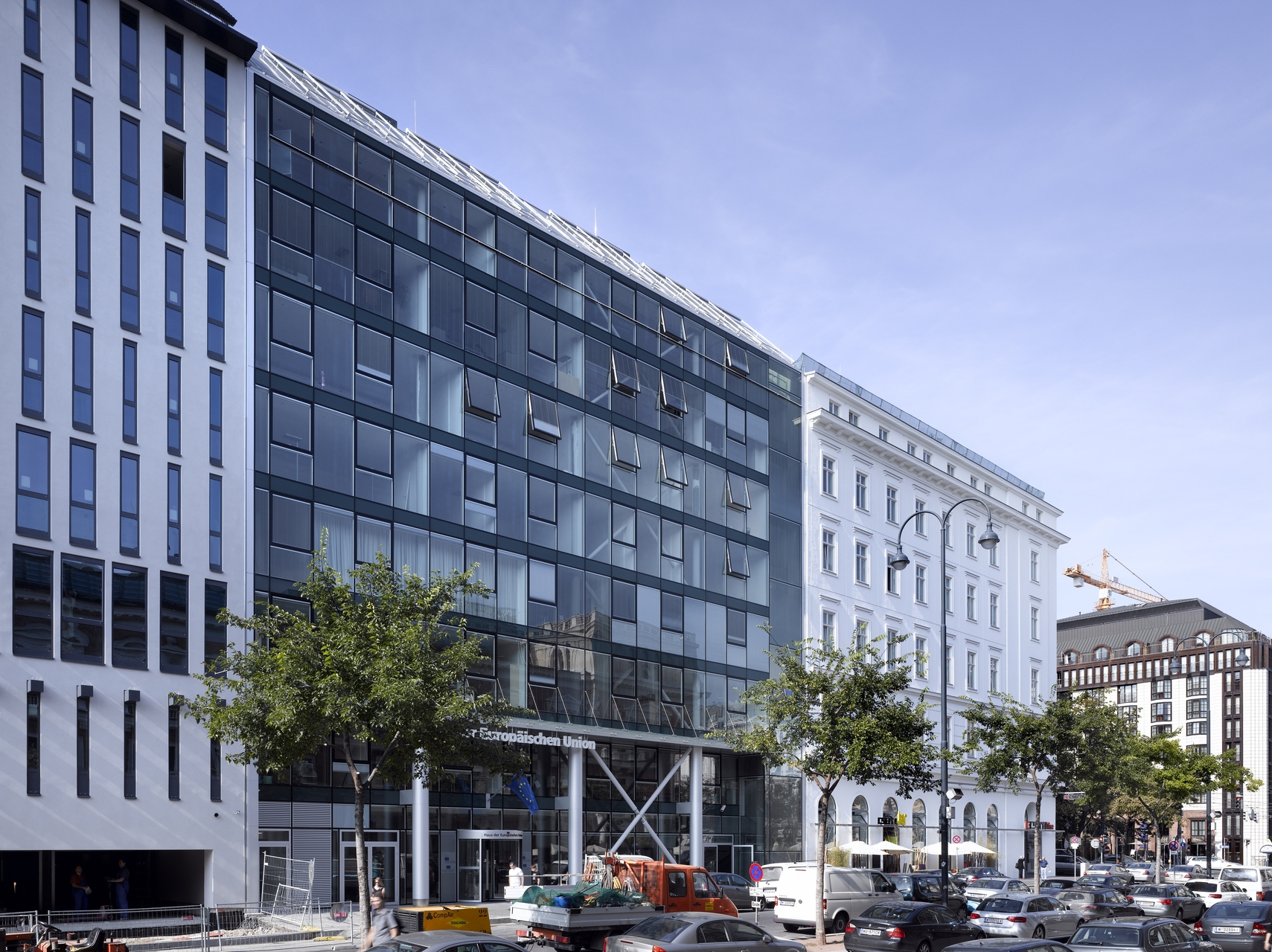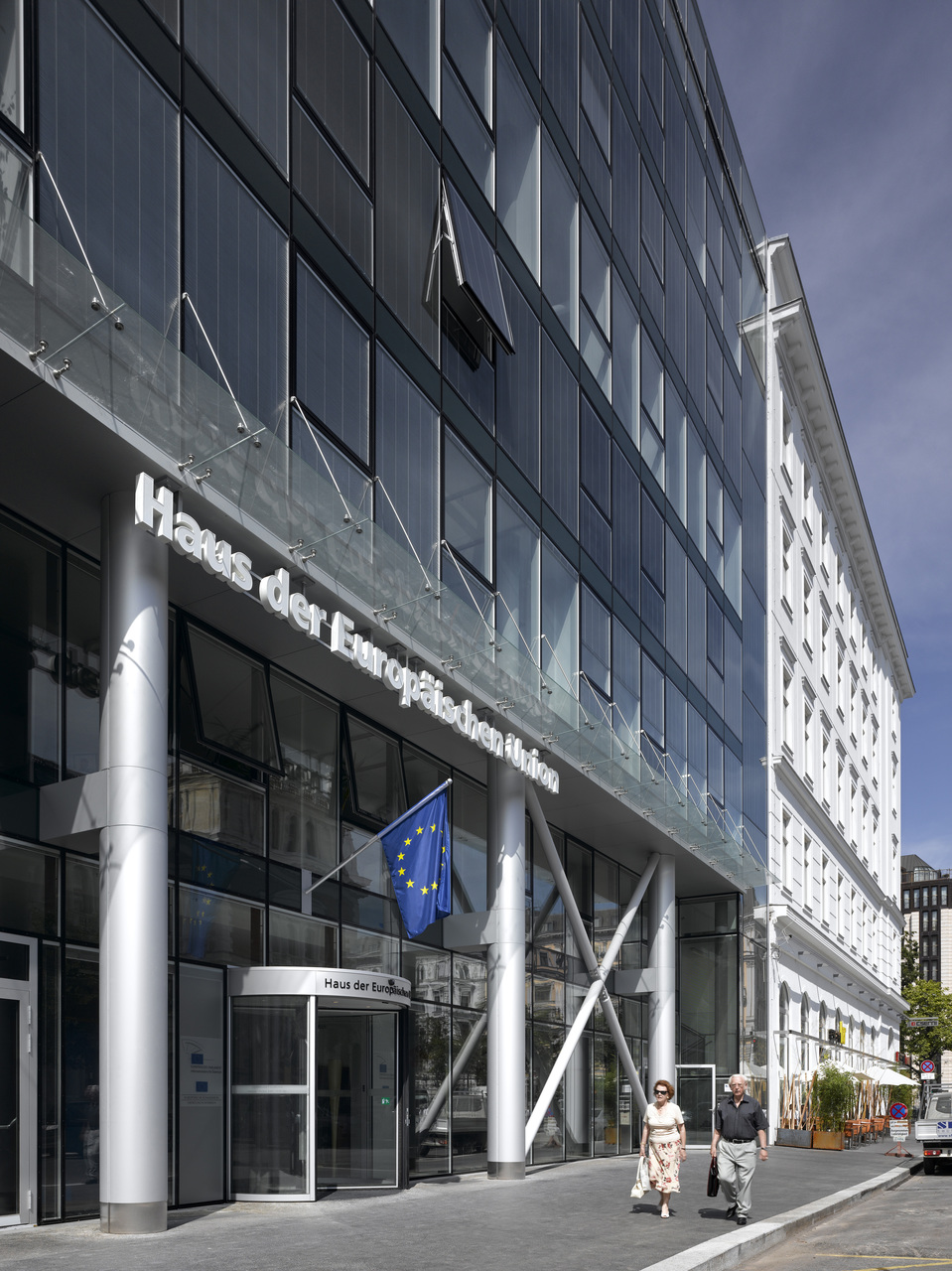 In den ersten drei Geschossen befindet sich das „Haus der Europäischen Union“, dessen großzügiges Foyer sich im Erdgeschoss bis zum überdachten Innenhof erstreckt. Der Veranstaltungsraum kann durch Schiebewände vom Foyer separiert werden. Diese Bereiche sind öffentlich zugängig und dienen der Informationsvermittlung über die EU. Das Gebäude verfügt in den Bürogeschossen über einheitliche Raumhöhen von 2,80 m. Im Dachgeschoss befinden sich vier großzügige loftartige Wohnungen mit Dachterrassen. Die Raumhöhe beträgt 2,70 m und steigt sich im Wohnbereich auf etwa 5 m an. Die Terrassen werden über eine wohnungsinterne Treppe erschlossen, wobei der vollverglaste Dachausstieg gleichzeitig ein attraktives Oberlicht bereitstellt.
