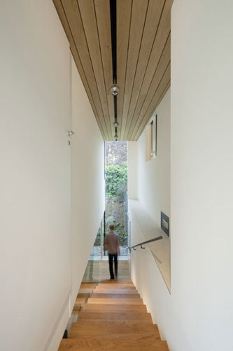 Um den Raum vollwertig nutzbar zu machen, entschieden sich die SUE Architekten dazu, das Grundstück im Osten abzugraben und morgendliches Sonnenlicht nach unten zu führen. Das hölzerne Podest unter der Glasfassade birgt Stauraum. Ein riesiger Whirlpool, eine Cocktailbar und Kugelstrahler im Siebzigerjahre-Design machen aus dem Raum unter der Erde einen hedonistischen Spa-Bereich. „Freunde einladen, den einen oder anderen Cocktail trinken und stundenlang baden - so stellen wir uns die Freizeit vor.“