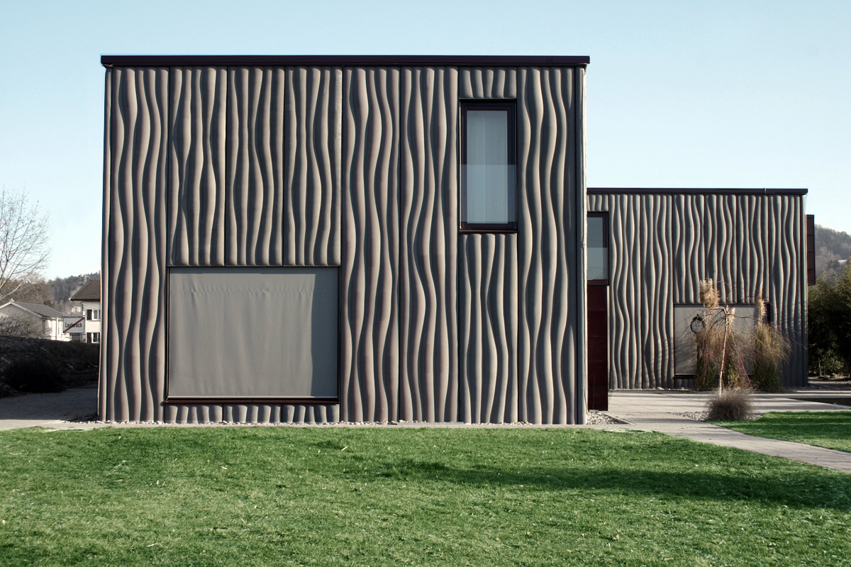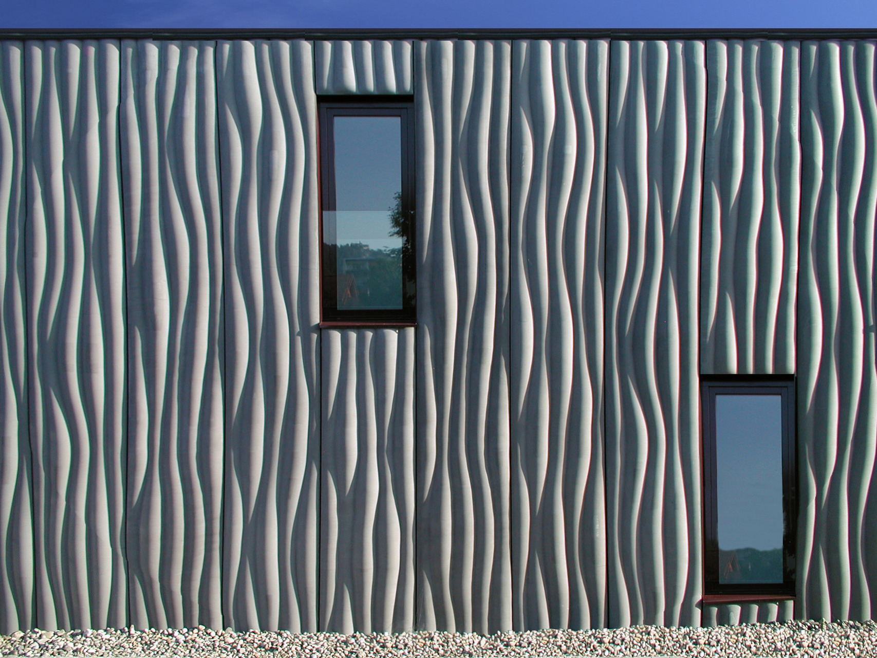 Und nun die Lüftung des Geheimnisses: Bevor der Beton sehr unregelmäßig in die präparierte Schalung floss, wurde ein weiches, elastisches Latexgewebe eingelegt. Aus der industriellen Schalung entstand am Ende ein plastisches Unikat, das am gemauerten und isolierten Haus wie eine herkömmliche vorgeblendete Fassade befestigt wurde.