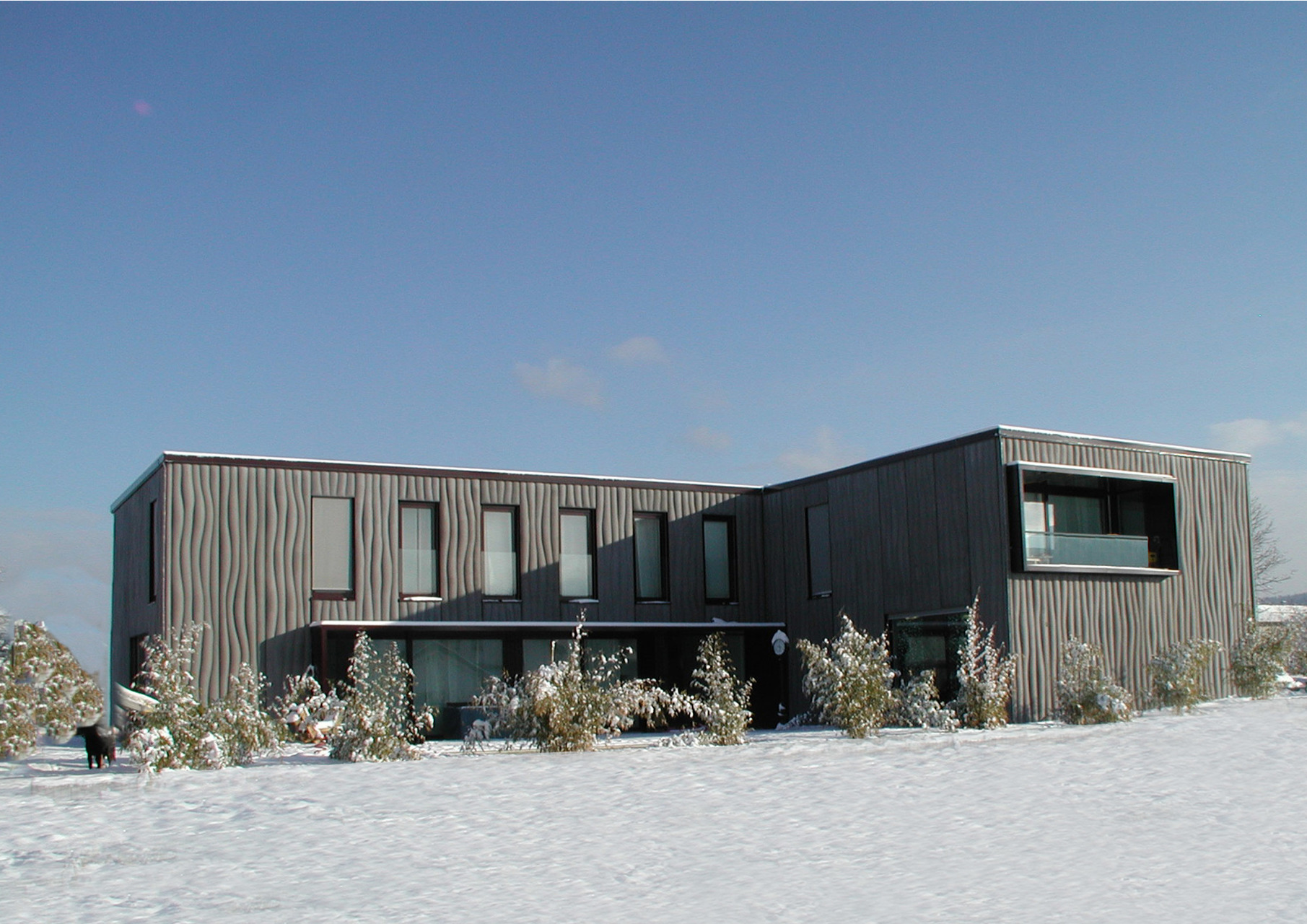 Mit einem L-förmigen, zweigeschoßigen Baukörper reagierten die Architekten auf die lärmbelastete Situation. Straßenseitig wird mit Nebenräumen und einigen wenigen Fenstern großflächig abgeschottet, nach Süden öffnet sich das Gebäude und macht Platz für eine geschützte Terrasse.