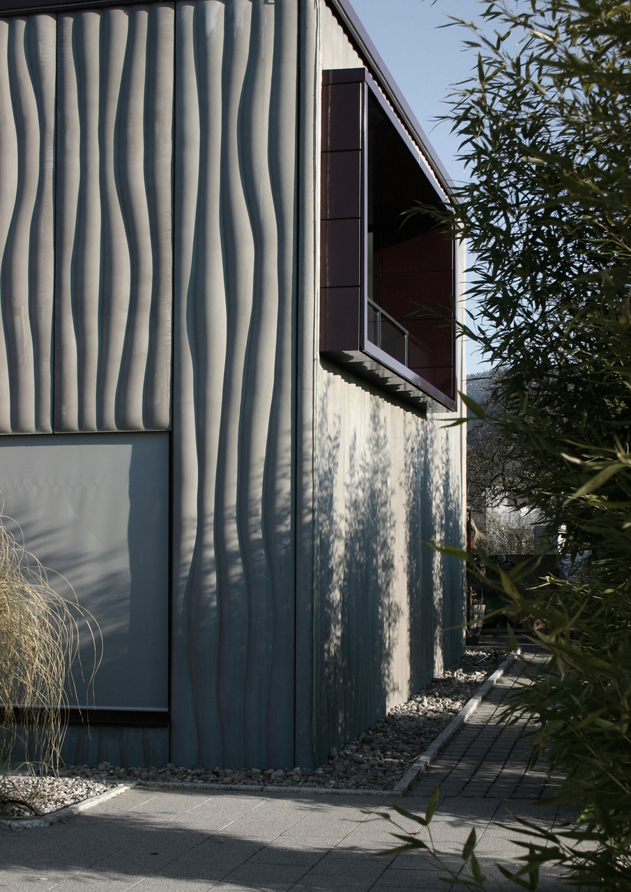 Die aalglatte Oberfläche der Außenhaut mit ihrem voluminösen Schattenspiel spiegelt nicht nur die Leidenschaft der Bewohner zu ihren Berufen wider, sondern lässt fast vergessen, das Haus weiter zu entdecken. Drei markante Einschnitte in rot lackiertem Aluminiumblech durchbrechen den strengen Baukörper. Einer davon ist die Überdachung für Haustüre, Geschäft und Garage, die zeitweise etwas zweckentfremdet für Blumengestecke offen steht. Über dem Laden ist die hineingesteckte Loggia der Einliegerwohnung so angeordnet, dass die Privatsphäre beidseitig gewahrt bleibt.
