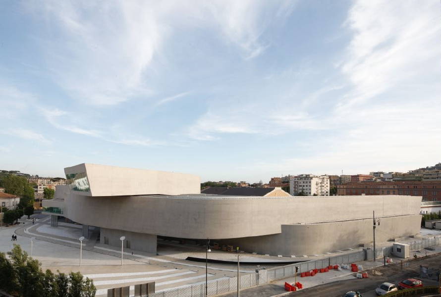 In Rom konnte Hadid „der langen Tradition der Italiener im modernen Betonbau“ vertrauen, wie sie Pier Luigi Nervis naher Palazzetto dello Sport aus dem Olympiajahr 1960 verkörpert. Für die gewölbten Betonwände wurden 14 Meter hohe Schalungselemente angefertigt, besonderes Schalholz aus Skandinavien wurde mit Phenolharzen behandelt. „Beton hat eine raue Qualität, die ich sehr mag“, schwärmt Hadid, „er gibt der Architektur eine vitale, erdige Ausstrahlung.“ Wirkt die massive Hülle aus Sichtbeton von außen fast abweisend, überraschen die Innenräume durch ihre Dimensionen und ihre Helligkeit. Beim Gang durch die drei Ebenen des Hauses finden schwindelfreie Besucher nach der Achterbahn von Kurven, verschlungenen Gängen und Traversen erst am höchsten Punkt ihre Orientierung wieder: In 23 Metern Höhe öffnet sich eine ansteigende Galerie zu einem mächtigen Schaukasten und gibt durch eine nach innen geneigte Glasscheibe den Blick nach draußen frei. Der weiße Kies erinnert an aufgelassene Bahngeleise, die Bäume und die von Hadid entworfenen fließenden Bänke suggerieren ein Bild entrückter Ruhe - ohne Straßen, Autos und den pulsierenden Verkehr der Hauptstadt.
