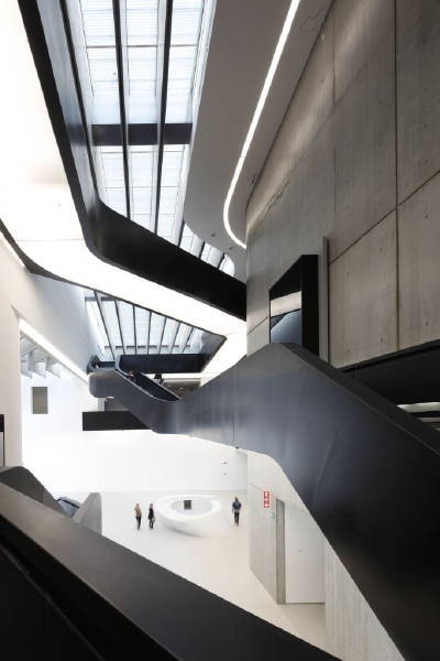 Tritt der Besucher ins imposante Foyer, erliegt er umgehend der Dynamik schwebender Rampen und lichter Schneisen, dem Geflecht schwarzer, mit milchigen Lichtbändern unterlegter Treppen, die sich wie ein schwereloses Skulpturengewirr in die Höhe winden. Ein Zentrum ist in dem Kaleidoskop dissonanter Bewegungen nicht auszumachen. Wer sich den Treppen und Gängen anvertraut, taucht in ein spannendes Wechselspiel von Schwere und Leichtigkeit. Ununterbrochen ergeben sich neue Durchblicke und Perspektiven. Der Besucher lässt sich im Bewegungsstrom von Zada Hadids „verflüssigten Räumen“ förmlich treiben.