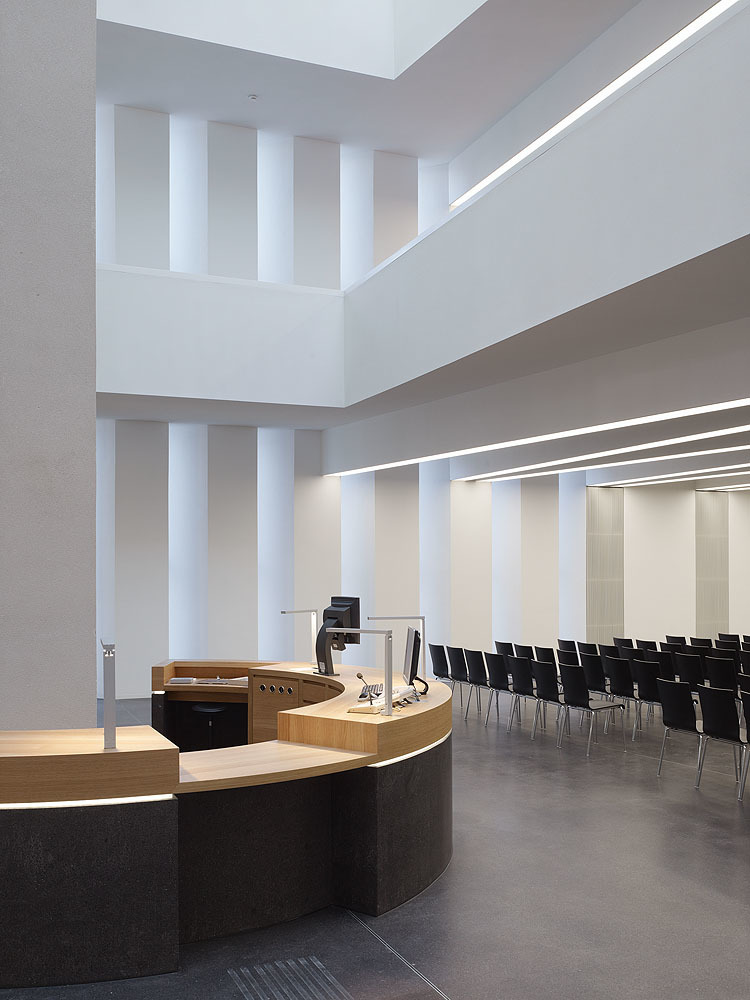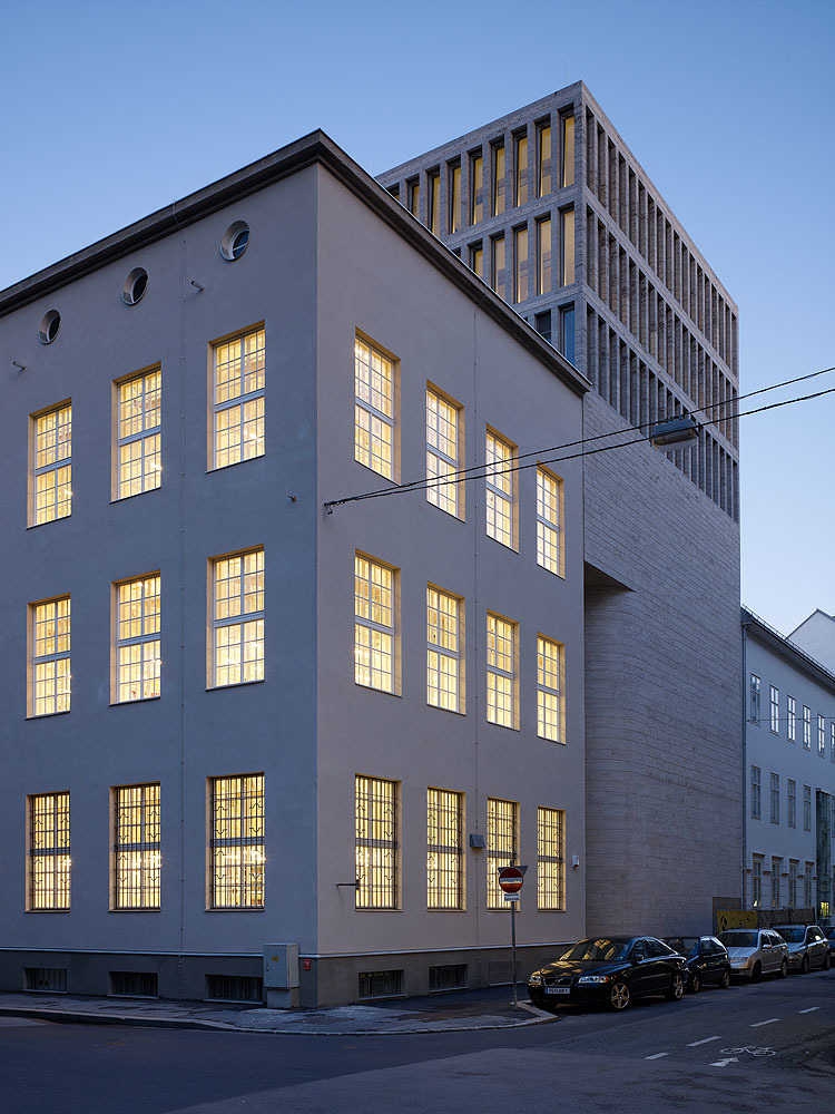 Die Form dieses Passstückes ergibt sich aus den Grundstücksgrenzen, den städtebaulich erforderlichen Abstandsflächen, sowie der hofseitigen Aussenkontur des Altbaues. Beide Bauteile werden direkt und ohne separate ‚Kopplungsstücke’ miteinander verbunden. Die Fügung von Alt und Neu wird durch die einschwingende Ecke an der Rainerstrasse, die Übernahme wesentlicher Proportionslinien und das Glasdach der Halle thematisiert. Unter dem Glasdach, in der Mitte des Hauses, an der wichtigsten Schnittstelle von Bestand und Zubau befindet sich ein vom bisherigen Innenhof abgeleiteter zenital belichteter Luftraum mit zentraler Infotheke.