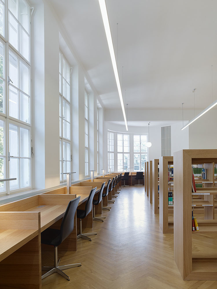 Der Altbau nimmt mit seinen Einzelräumen die Funktionen auf, die abgeschlossener Räume bedürfen, während der Neubau nahezu ausschließlich als Regalstellfläche dient. So kann die Grundrissstruktur des Altbaues erhalten bleiben und trotzdem dem Gesamtziel einer neuen, offenen Bibliothek entsprechen.