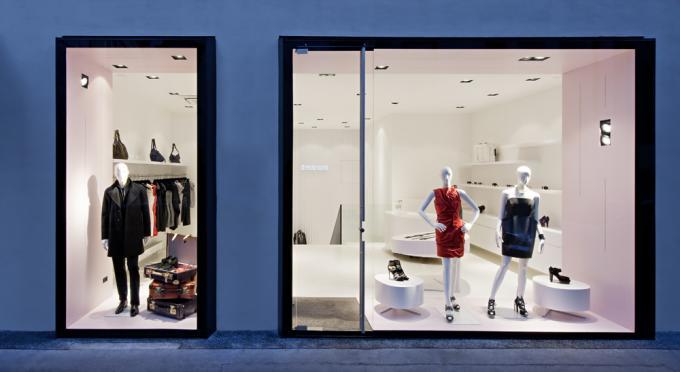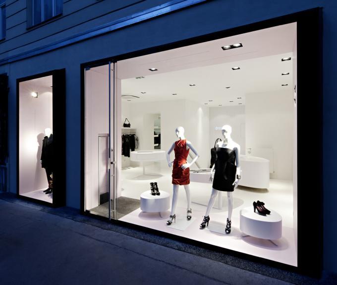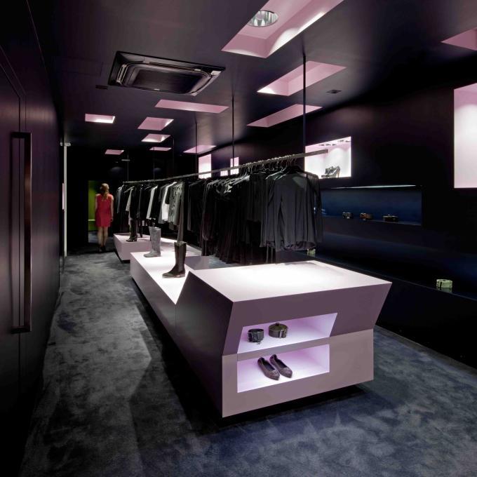 Zur Straße öffnet sich das lichtdurchflutete, reinweiße Erdgeschoss. Dieser Raum ist große Bühne und Visitenkarte. Die darin locker aufgestellten Präsentationsmöbel wurden schon in der Planungsphase „Fips“ getauft. Im Erdgeschoß hofseitig an die Schaubühne angeschlossen das diskrete Boudoir. Die zentrale Lage der Treppe und deren Funktion als Verknüpfung der beiden Ebenen sind von großer Bedeutung. Vom Petersplatz sichtbar, will die Treppe begangen werden und unaufgeregt, wie selbstverständlich ins Untergeschoß leiten.