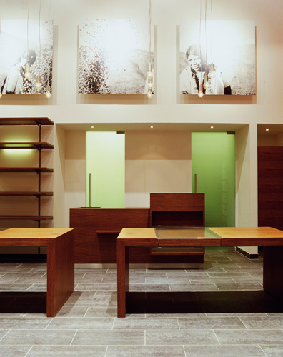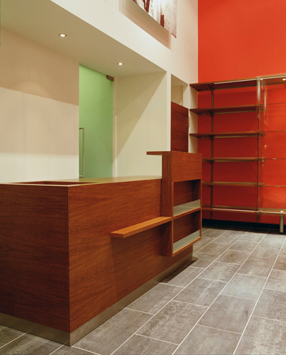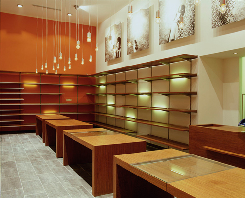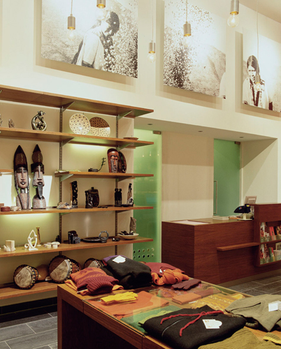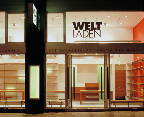 Die Seitenwände des Raumes sind farbig gestrichen, ein elegant adaptiertes handelsübliches Regalsystem, das sich über Seiten- und Rückwände zieht, dient der Präsentation der Waren. Die sinnlichen Oberflächen der Produkte aus Seide, Porzellan, Glas und Töpferwaren kommen vor diesem funktionellen Hintergrund – verwendet wurde vorwiegend rötlichbraune, heimische Raucheiche – besonders gut zur Geltung. Dem ideellen Konzept des Weltladens entsprechend wurde die Einrichtung als Low budget-Projekt geplant und ausgeführt. Mit den großformatigen Schwarzweiß-Fotografien an der Rückwand, mit der punktuellen Beleuchtung und der warmen Farbstimmung konnte ein Ambiente geschaffen werden, das Funktionalität und einladendes Raumklima verbindet und so die Bauaufgabe Weltladen neu interpretiert. (Text: Architekten)