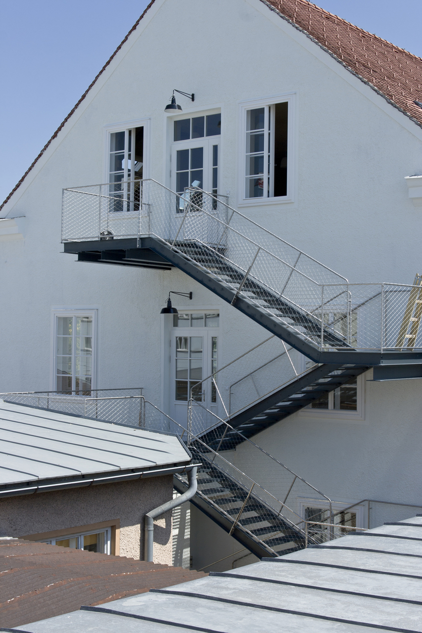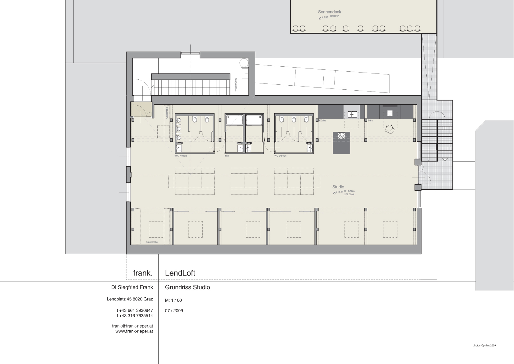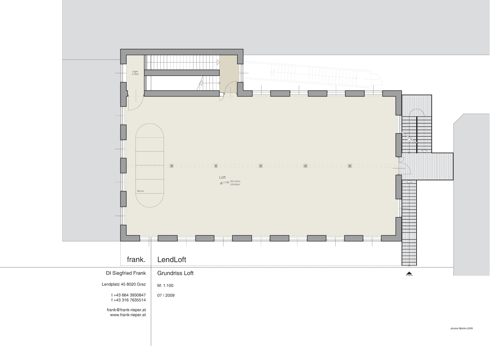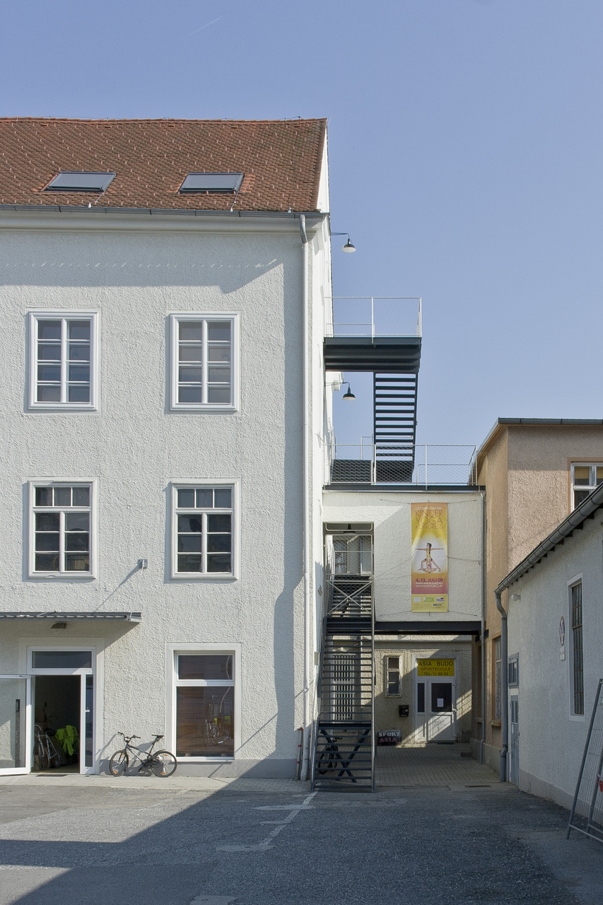 Eine neue außenliegende Stahltreppe führt, einen der charakteristischen alten Übergänge zwischen den Gebäuden des Areals querend, bis ins Dachgeschoß in den kleineren der beiden Veranstaltungsräume, der auch die gesamte Infrastruktur beinhaltet. Das Dachtragwerk wurde, ebenso wie der alte Holzboden, erhalten und strukturiert den Raum um den zentralen Mittelbereich: Büro, Küche und „Wohnzimmer“, einige Nischen, die auch als Zimmer verwendet werden können, und drei weiße Kuben, die die Sanitärräume aufnehmen. Der Lehmputz über der ökologischen Dämmung garantiert ein angenehmes Raumklima, große Dachfenster lassen Tageslicht in den früher dunklen Dachboden fluten. Das bestehende Stiegenhaus, in das ein Lagerraum gehängt wurde, führt ins 2.OG hinunter. Fünf alte Eisensäulen verleihen dem 280 m² großen Raum einen industriellen Charakter, in die Decke integrierte, vom Dachgeschoß aus installierte, Leuchten lassen ihn in verschiedenste Lichtstimmungen tauchen. Der Schwingboden macht das Loft als Tanzsaal nutzbar und neue, handgefertigte Kastenfenster, die von der engen Zusammenarbeit mit den Handwerkern zeugen, lassen in die Baumkronen des Gartens blicken. Auf dem Flachdach des Nebengebäudes konnte ein Sonnendeck errichtet werden, das einen weiten Blick auf die heterogene Bebauung des Viertels sowie auf den Schloßberg gewährt. Dezente Details, wie die emaillierten Blechleuchten, die sich im Wind wiegen, komplettieren den behutsamen Umgang mit dem industriellen Erbe des Quartiers. (Text: Martin Grabner)