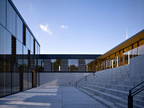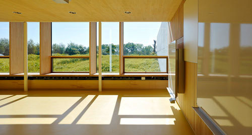 Durchblicke und Überblick lassen das Gefühl aufkommen, mitten in der Gegend zu sein. Dieser Bezug zu Außenraum und Natur ist Programm; ein großer Teil der Ausbildung findet draußen statt. Auch das begrünte Dach fügt sich in die umgebende Kulturlandschaft ein.