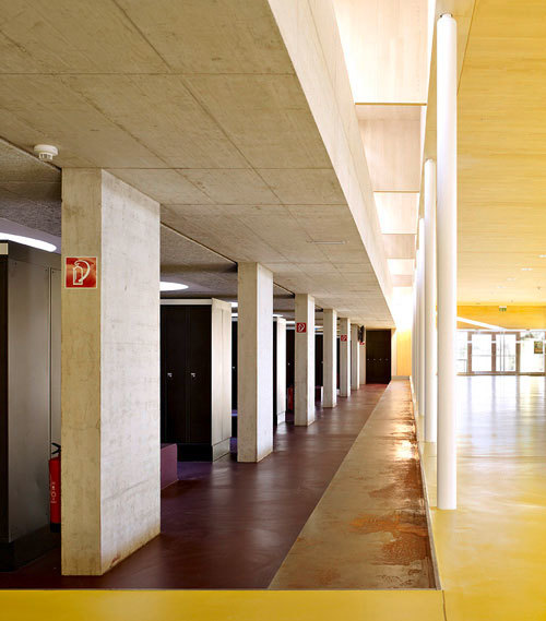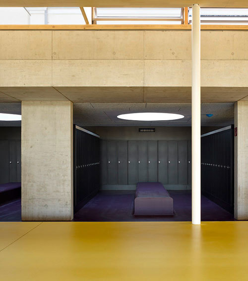 Einfache und gekonnte Details und gut gewählte Materialien unterstützen die Raumqualität. Gänge weiten sich und sind als offene Bereiche locker gestaltet. Knallgelber Industrieboden sorgt für Frische. Die Garderobe wiederum ist lila. So etwas ist oft zuviel. Hier wirkt es sparsam und richtig gesetzt. Die Abwechslung und Offenheit (man sieht viel, man hört viel, aber es ist nie laut) nennt Direktor Franz Zobl „bewegungsfördernd“. Genau das soll Schule können: Grundlage für einen beweglichen Körper und Geist sein.