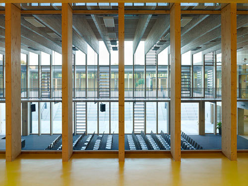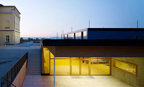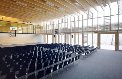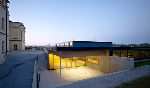 Neben der organisatorischen Lösung, einem neuen Eingang mit zentraler Garderobe, besticht der Zubau aber vor allem durch den Stil, die architektonische Haltung. Zu einem guten Teil im Erdreich versenkt, ist die Basis in Sichtbeton gehalten. Alles darüber jedoch ist, auf Vorgabe des Bauherrn, das Land OÖ, ein filigraner Holzbau. In der Mitte befinden sich, typologisch angelehnt an einen Vierkanthof, der Mehrzwecksaal und ein Pausenhof. Diese bilden das offene Zentrum, um das die Unterrichtsräume, die Bibliothek sowie Foyer und Garderobe angeordnet sind. Der Saal wird stark von Externen genutzt. Konzerte mit bis zu 500 Personen haben hier schon stattgefunden; gute Akustik inklusive.