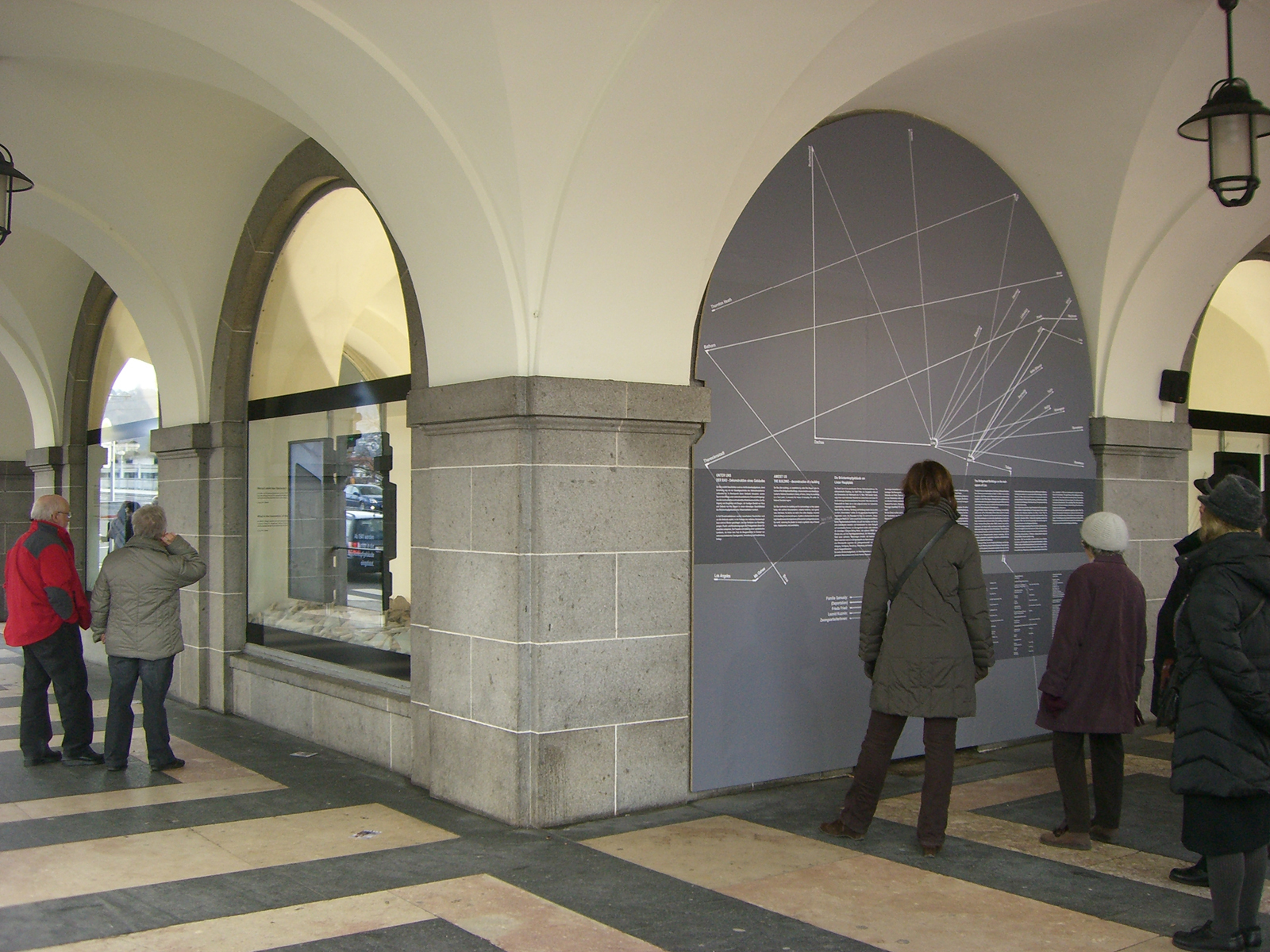 In fünf Einzelinstallationen werden verschiedene Geschichten rund um die Gebäude erzählt. In die Fassade des östlichen Brückenkopfbaus wurde unter der architektonischen Leitung von Gabu Heindl ein Muster geschlagen, das den Verläufen von Verschleppungen, Flucht- und Reisebewegungen der Protagonist:innen dieser Geschichten entspricht. Die Fassade wird dabei zu einer symbolischen Landkarte, die hinter dem Putz die Baugeschichte im Kontext von nationalsozialistischer Zwangsarbeit, Vertreibung und Auslöschung freilegt.