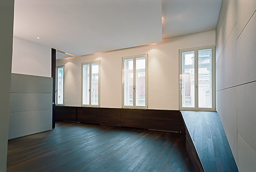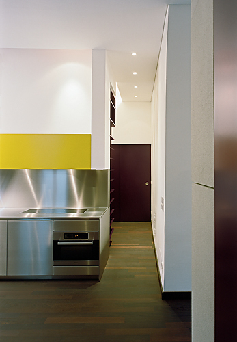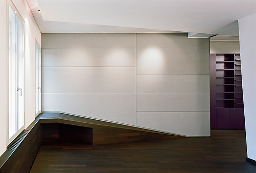Beim hier gezeigten Wohnungsumbau sollten die genannten Qualitäten verstärkt, die Defizite in der Nutzbarkeit jedoch behoben und eine völlig neue formale Identität geschaffen werden. Ausgangspunkt war die Verlegung des Kochens in das Zentrum des Geschehens und dessen fließende Verbindung mit einem vergrößerten Wohnzimmer. Dazu wurde der vorhandene Raum scheinbar, mit Unterstützung einer diagonal verlaufenden Lichtfuge an der Decke, gestreckt und die massive Mittel- und Kaminwand, die Schräglage des äußersten Kamins aufnehmend, sozusagen wie ein Vorhang zur Seite geschoben. Gleichzeitig jedoch wurden funktional hochwirksame Zonen geschaffen, wie ein neuer Eingangs- und Garderobenbereich, ein neuer Bade- und Hauswirtschaftsbereich und drei neu dimensionierte Zimmer. Der Raum erfährt dabei eine Verdichtung. Zwei der Zimmer enthalten Hochplateaus mit eingebauten Betten und darunter befindlichen Schrankräumen, eines kann mittels einer Schiebewand großflächig geöffnet und an den Wohnbereich angeschlossen werden. Die Verdichtung des Raums kann hier aufgehoben und in eine Streckung übergeleitet werden. Bei diesem Vorgang wird die gesamte Außenwand freigelegt. Durch das bündige Einsetzen von neuen Isolierglasfenstern als Innenfenster, deren Holzrahmen unter dem weiß emailliertem Glasfalz verdeckt liegen, erscheint diese Wandfläche als homogene Fläche unterschiedlicher Reflexionsgrade und Transparenzen. Das klassische Fenster in Rahmen und Wandöffnung wurde somit aufgehoben.