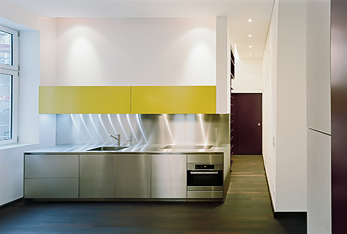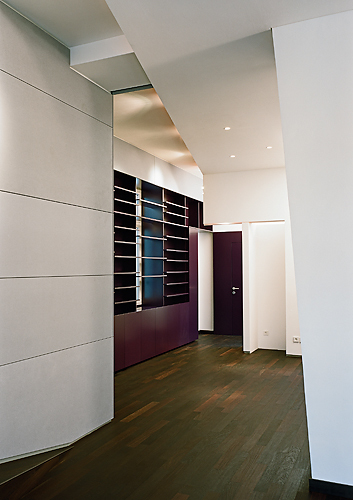 Vier neue Elemente durchziehen frei das Raumkontinuum, um unterschiedliche Raum- und Funktionsqualitäten hervorzubringen: eine Schale aus Faserbetonplatten, Boden- und Wandflächen aus Wenge, sich frei faltende Decken- und Wandflächen aus Gipskarton sowie seidenmatt lackierte Möbelelemente, in die die rahmenlosen Zimmertüren sowie ausreichende Regal, Schrank- und Stauflächen eingebaut sind. Alle Räume sind funktional mehrfach belegbar und so entstand durch den massiven Umbau in gewisser Weise erneut eine Gründerzeitwohnung im besten Sinne. Lediglich ein Balkon fehlt: Aus diesem Grund führt eine Rampe auf eine kleine Ebene auf Fensterparapethöhe und bietet dort einen nicht zu unterschätzenden Ersatz! (Text: Architekten)