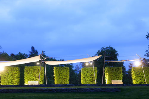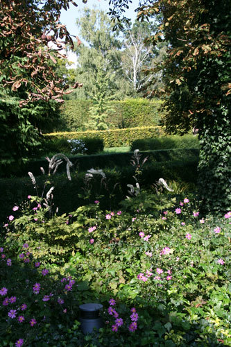 Im Osten begrenzen alte Bäume diesen Raum. Um eine Verbindung zwischen Burg und der kleinen Sitznische im Baumhain herzustellen, führt ein Plattenweg dorthin.