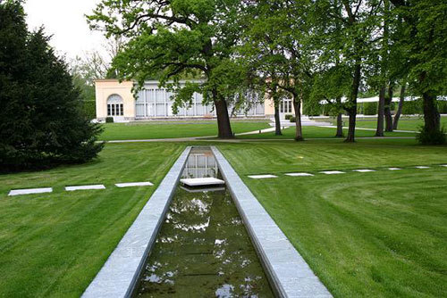 Gleich nach dem Betreten des Burggartens wird der Blick durch richtungsweisende Heckenstreifen zur Orangerie gelenkt. Das historische Orangeriegebäude wurde einer neuen Nutzung als Veranstaltungsort zugeführt.