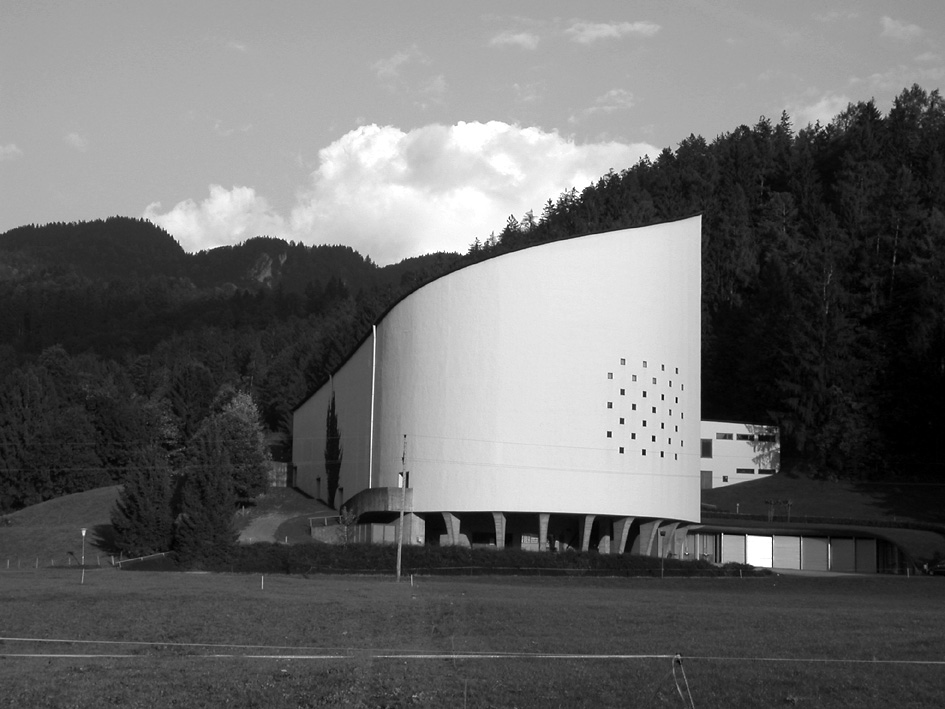 Der weiße Baukörper am Fuß der Niederndorfer Berge nützt einerseits die Hanglage für den ansteigenden Zuschauerraum und entwickelt sich andererseits in Richtung Schau- bzw. Talseite zur gestischen Form des Bühnenhauses.