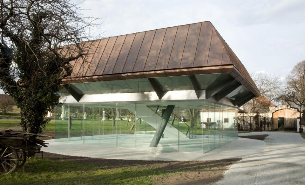 Da viele der Exponate bemalt sind und somit nicht dem direkten Sonnenlicht ausgesetzt werden dürfen, stülpen wir ein Zeltdach mit heruntergezogenen Rändern zum Schutz über den künftigen Inhalt – so kommt es gleichzeitig zu einer Äquivalenz zum Mühlenturm und zum benachbarten Ausstellungsgebäude des Architekten Spalt, der bereits während unseres Studiums unser Professor war – wir haben hier neben seinen Vorstellungen von Leichtigkeit, seinem Rastermaß von 1,25 m auch die verglaste Aussenraumkubatur seines Atriumhofes als ebenfalls verglaste Innenraumkubatur unseres Erdgeschosses übernommen.