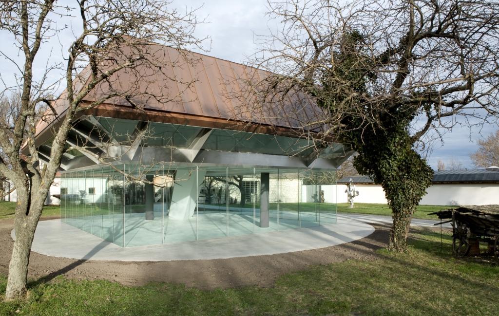Der weitläufige Außenraum inmitten von Weingärten, wird neben einem alten Baumbestand vor allem von den zahlreichen großformatigen Skulpturen von Wander Bertoni geprägt.