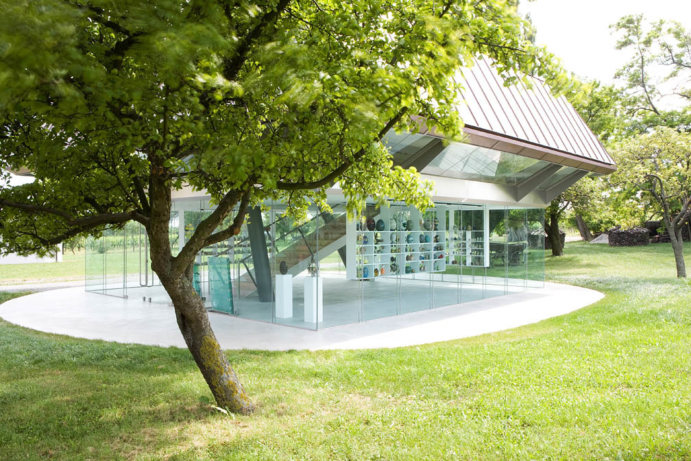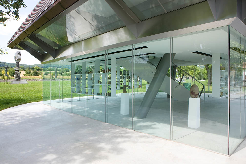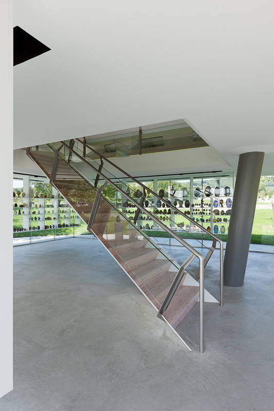 Das Gebäude beherbergt 2 vollkommen unterschiedliche Innenräume: der untere, komplett verglaste, sucht und schafft die Verbindung zur Umgebung. Dabei dient das EG auch bei geschlossenen Türen schon vorab als Vitrine und wird so auch Teil des Freilichtmuseums.