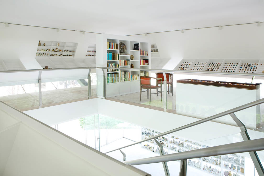 Innen dominiert die Farbe weiß, um den überwiegend sehr kleinen Exponaten einen maximal ruhigen Hintergrund zu geben. Einzig der Fußboden auf der Galerie macht hier eine Ausnahme: er ist aus Riemen von Lärchenschichtholzplatten und fließt zwischen den Stahlwangen der Stiege in Form von Treppenstufen bis hinunter zum Stahlbeton.